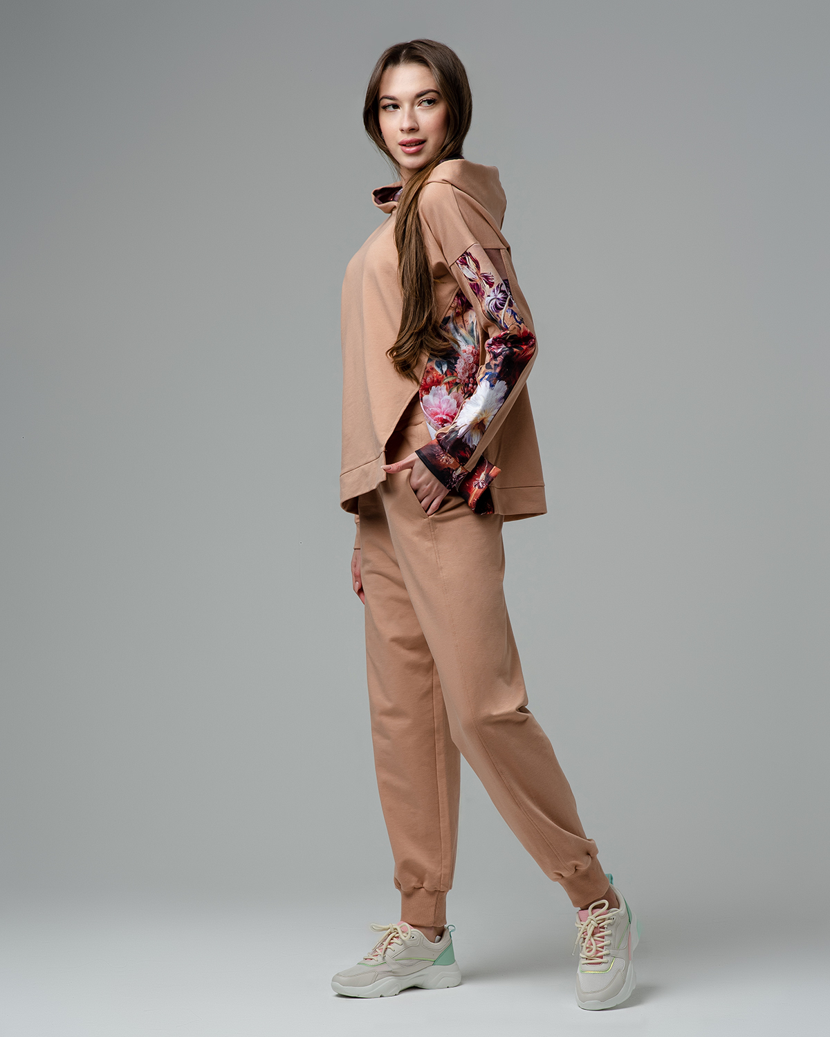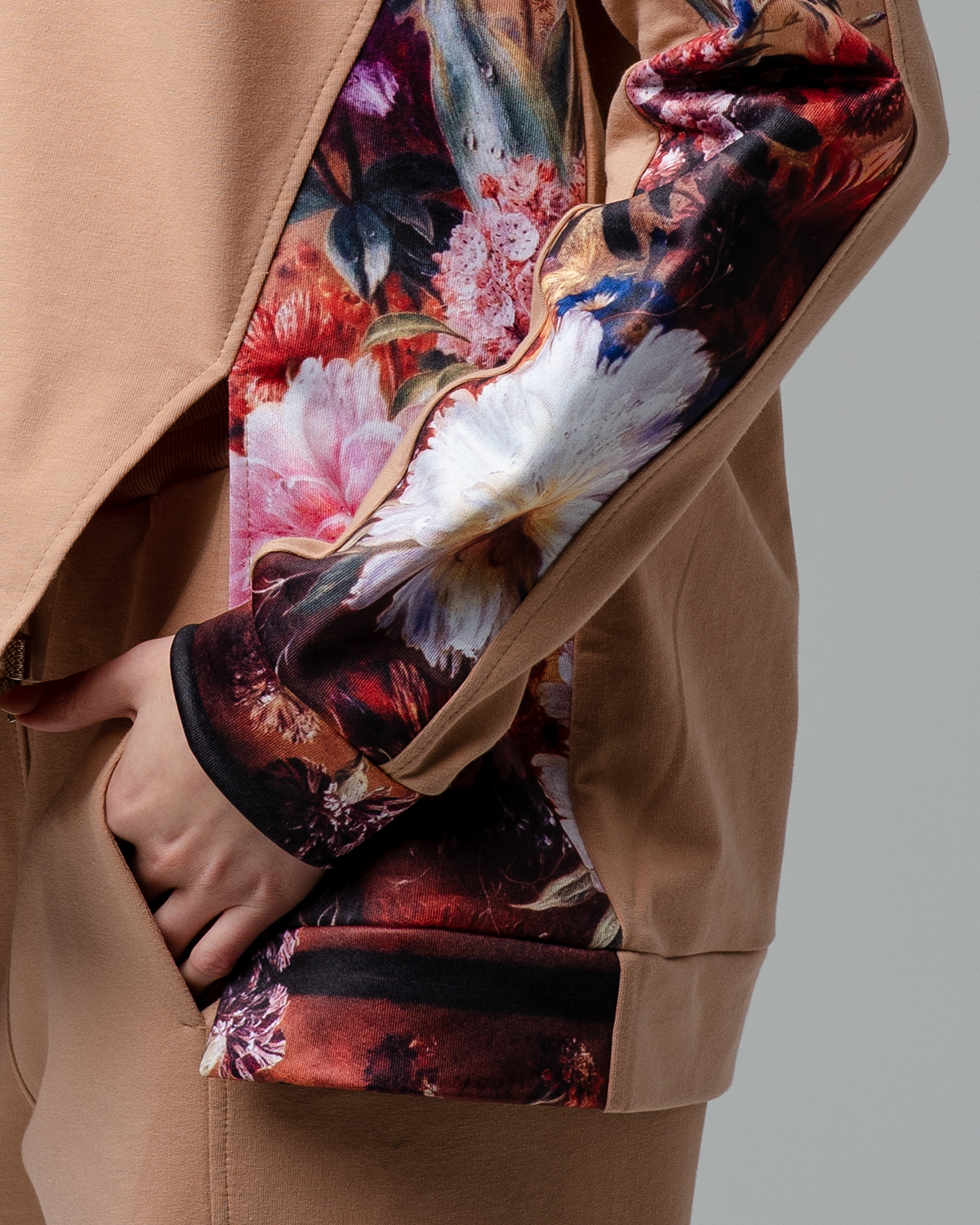 Эту дизайнерскую модель худи с капюшоном мы предлагаем тем, кто ценит индивидуальность и оригинальные вещи в гардеробе. Сбоку на изделии, а также на рукаве с переходом на манжету выполнена вставка с авторскими принтами наших художников. Рисунок повторяется и на шелковой подкладе капюшона. Благодаря специальной технологии изготовления принты сохраняют яркость и остаются такими же глубокими на протяжении долгого времени. Ассиметричный разрез добавляет в спортивный образ изюминку и учитывает последние модные тенденции.