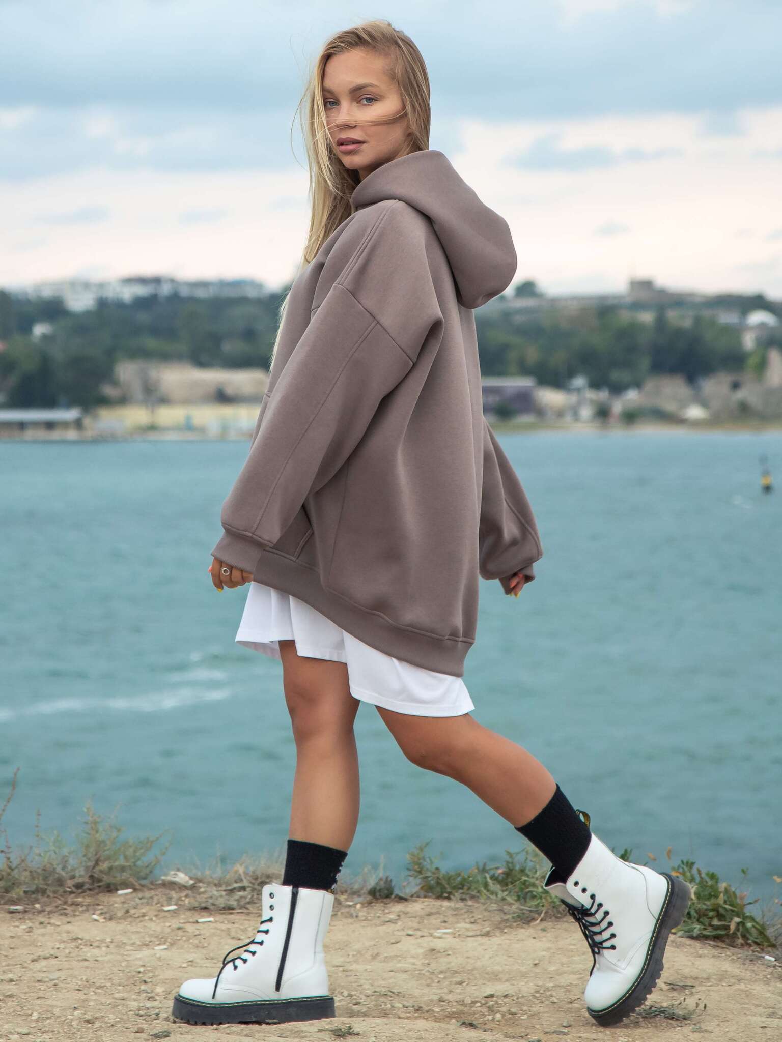 Женское оверсайз худи с начесом - идеальный выбор для комфортной повседневной носки. Изготовлено из высококачественного мягкого материала, который обеспечивает тепло и уют в прохладные дни. Свободный крой обеспечивает свободу движений, а начес внутри добавляет дополнительный уровень тепла. Большой добный капюшон защищает от ветра. Этот стильный и удобный худи станет незаменимым элементом гардероба для создания уютного и модного образа.