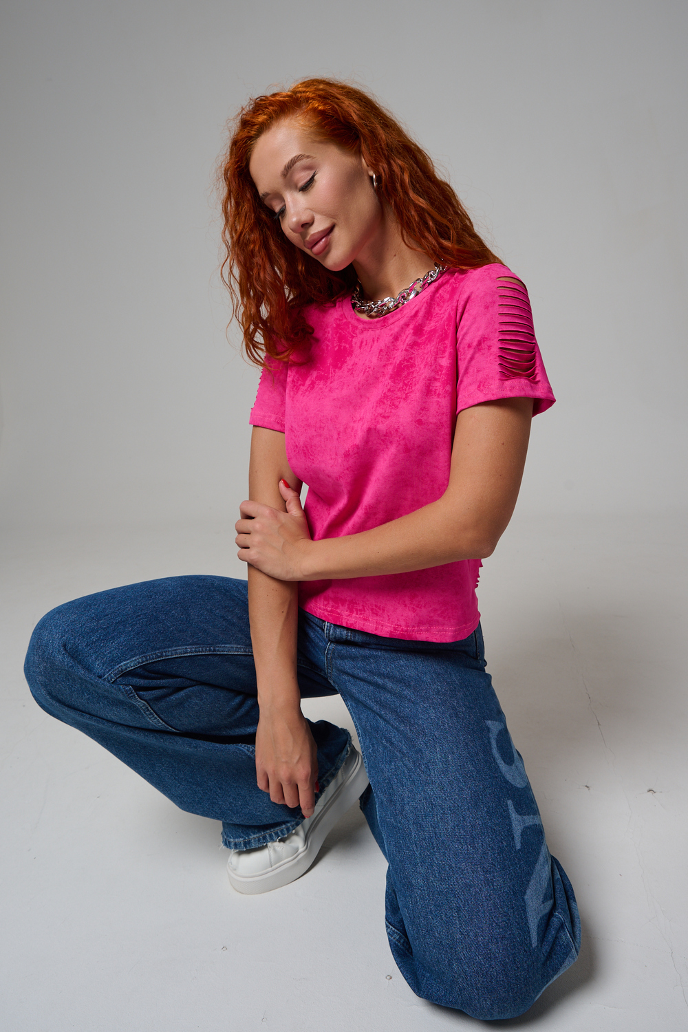 Трендовая футболка-оверсайз из качественного материала. Необычный оттенок и эффектная рваная обработка создают уникальный стиль.