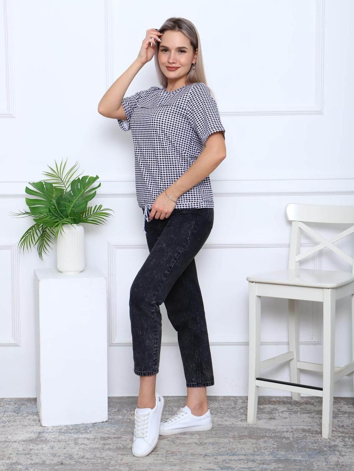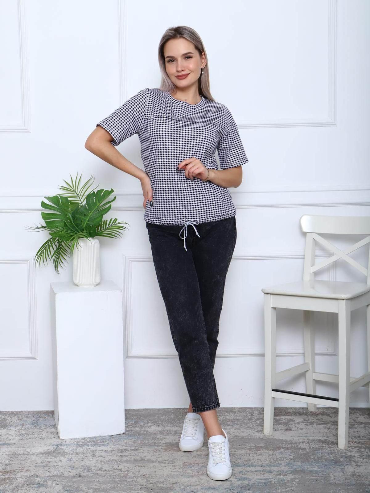Модная женская футболка из хлопка. Этот материал приятно лежит на коже и не растягивается. Футболка прямого силуэта с удлиненным рукавом. по низу изделия утягивающая кулиска с завязками. Хорошо сочетается с любой одеждой.