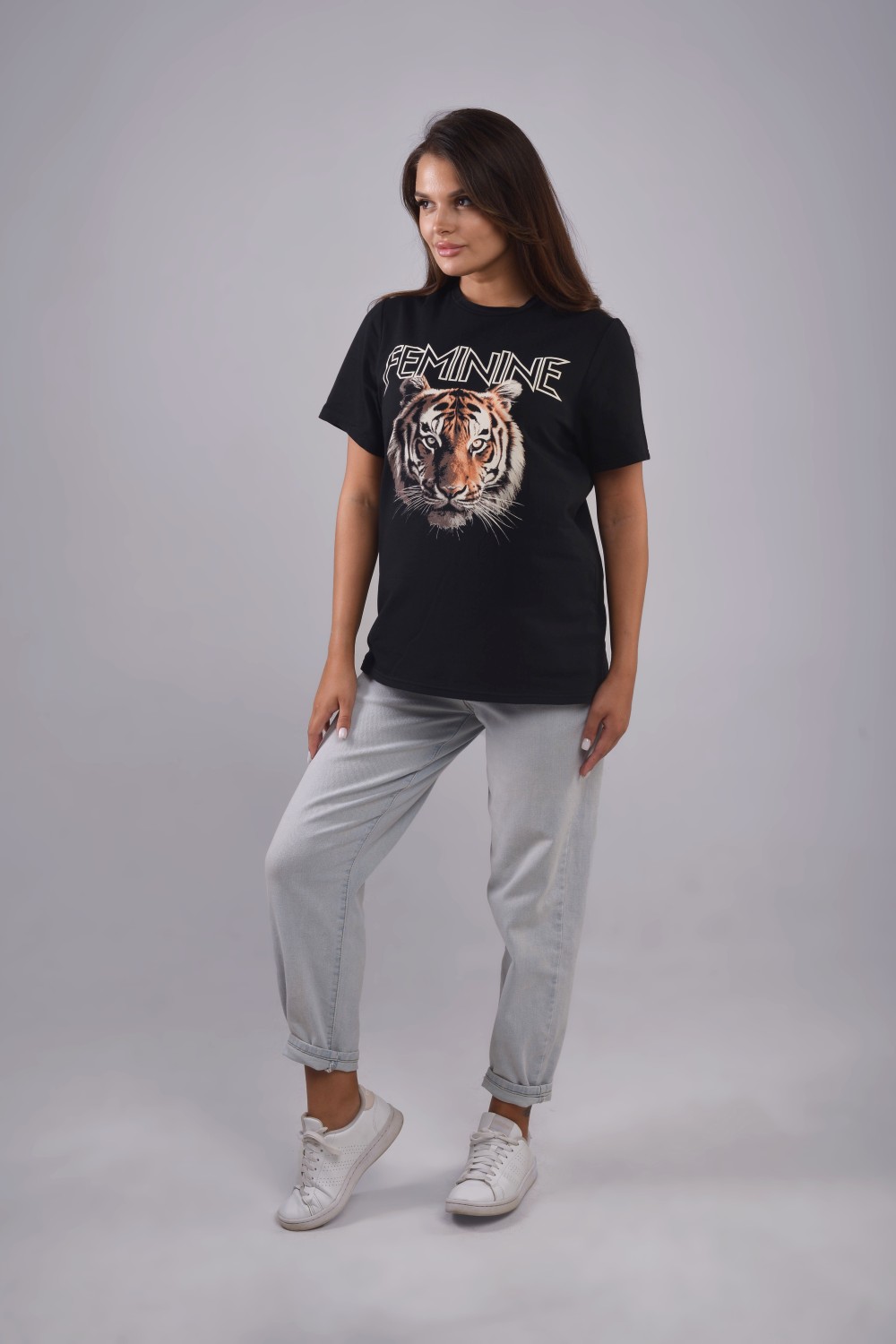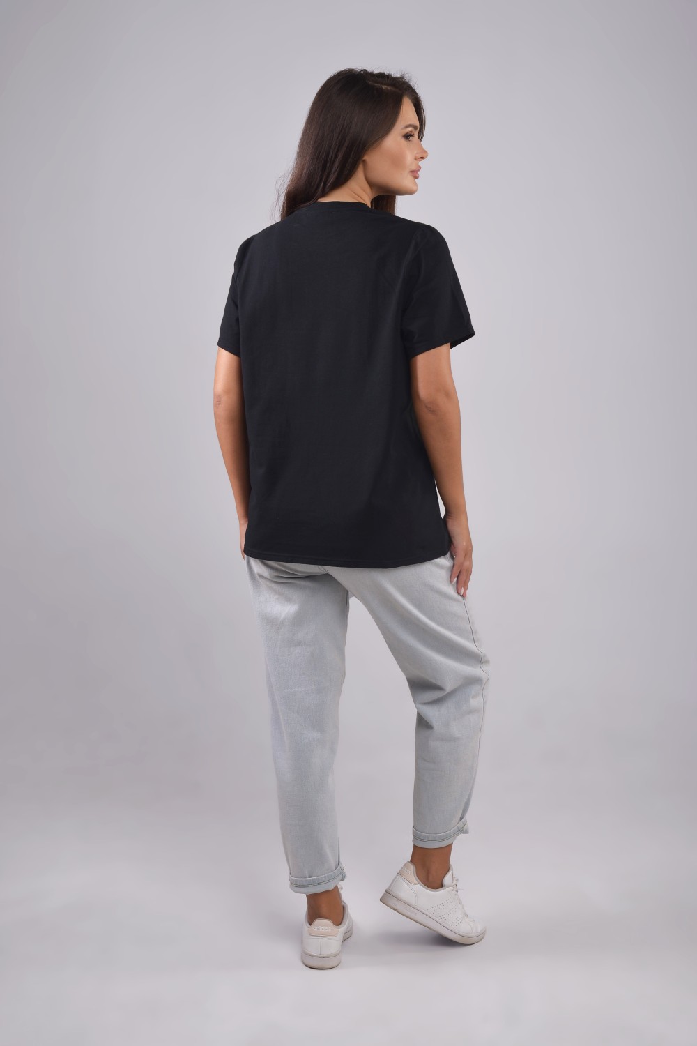 Футболка женская, повседневная, нарядная, спортивная, большие размеры, свободный крой, удлиненная, круглая горловина, черного цвета из трикотажного хлопок с эластаном, 170 г/м2 с прикольным принтом. Принт дисчардж (краска не наносится на ткань, а удаляется с неё со специально подготовленного пигментного слоя, становясь частью структуры волокон). Принт в стиле гранж, модный, яркий, идеальный выбор для повседневных образов, который подчеркнет вашу индивидуальность и женственность. Цвет: черный; Материал: коттон;хлопок стрейч;хлопок стрейч;коттон; Состав: 95% хлопок, 5% эластан.