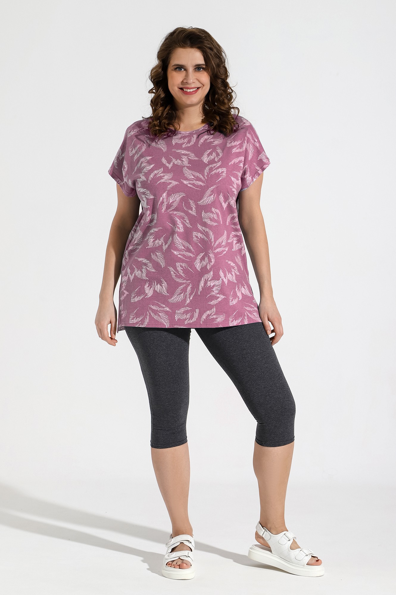 Костюм из трикотажного полотна «кулирка» в комбинации двух видов: гладкокрашеного «меланжированого» и с набивным рисунком, состоящий из футболки и бридж.Футболка – из полотна с набивным рисунком, с короткими цельнокроеными рукавами, горловиной овальной формы, окантованной основным материалом и разрезами по боковым швам. Бриджи-велосипедки – из «меланжированого» полотна, классического покроя, с эластичной тесьмой по талии.