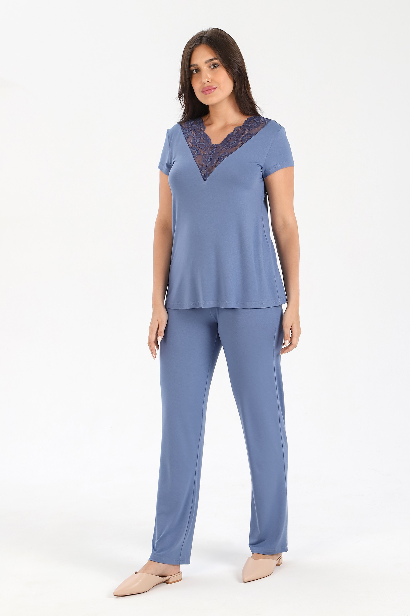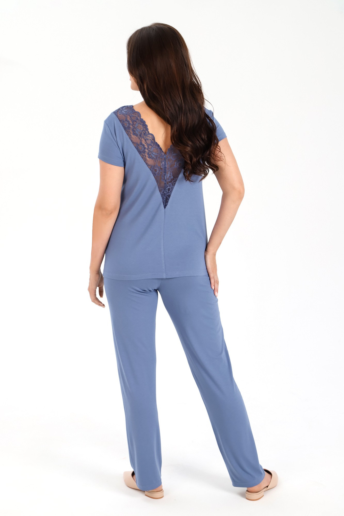 Пижама из гладкокрашеного вискозного трикотажного полотна, состоящая из футболки и брюк. Футболка - слегка расширенная книзу, с короткими втачными рукавами. Полочка и спинка – с V – образными кружевными деталями по горловине.