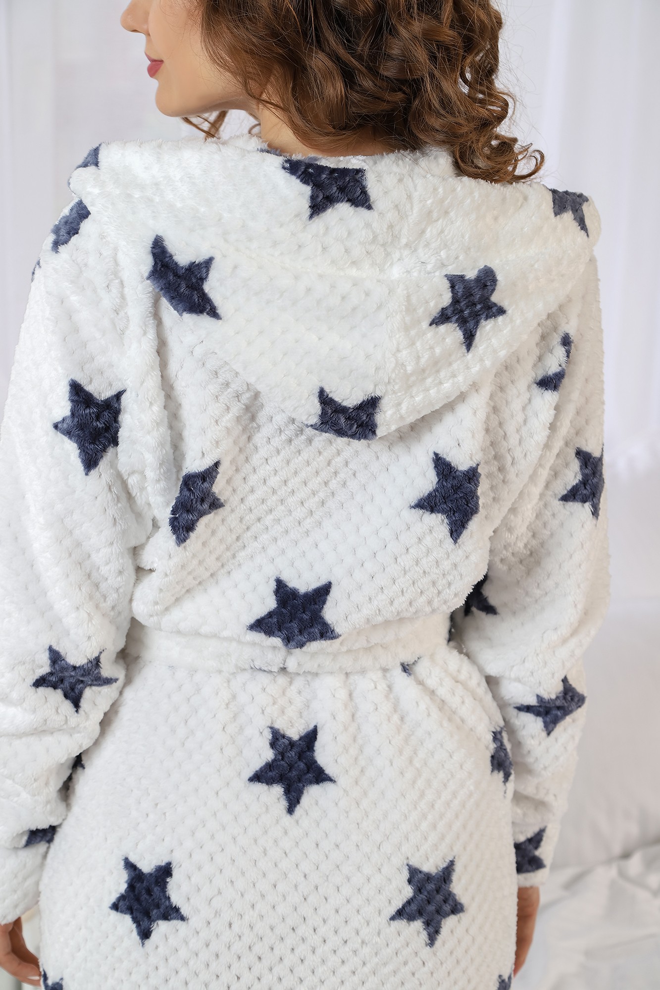 Халат молодежный из полотна «велсофт», прямого силуэта, на запахе, с втачными длинными рукавами, с капюшоном, карманами в боковых швах и съемным поясом, фиксирующимся на талии двумя шлевками в боковых швах.