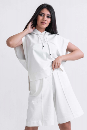 Новый летний дизайнерский костюм в спортивном стиле. Костюм для базового гардероба стильной современной девушки. Отличное решение на каждый день, для прогулок, отдыха, путешествий, поездок на море и пикника, для шоппинга. Для любого возраста и телосложения. Комфортный и женственный фасон - укороченная жилетка-худи свободного кроя, шорты с карманами, удобным поясом-резинкой, подчеркивающим талию, высокой посадкой и прямого кроя. В капюшон жилетки вставлен шнурок, который придает дополнительную стильность костюму. Ткань легко гладится, приятная на ощупь. Во время носки костюм сохраняет форму, не мнется. Трикотажный костюм это удобно и практично. Вам не надо думать, что надеть, у Вас всегда есть в шкафу уже готовый модный образ. Шорты и жилетку-худи можно носить по отдельности. Жилетку-худи рекомендуем носить с топом