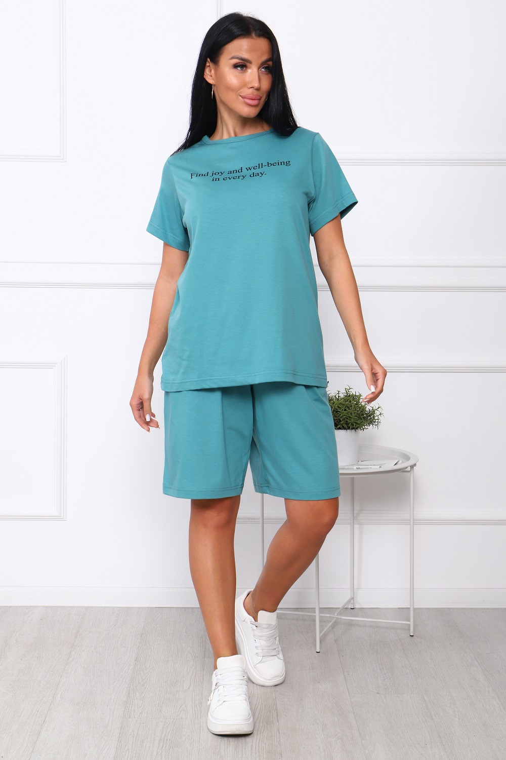 Костюм женский, лаконичный стиль: футболка прямого кроя, с короткими рукавами, с принтом в виде надписи на полочке и шорты на комфортном поясе, с удобными боковыми карманами.