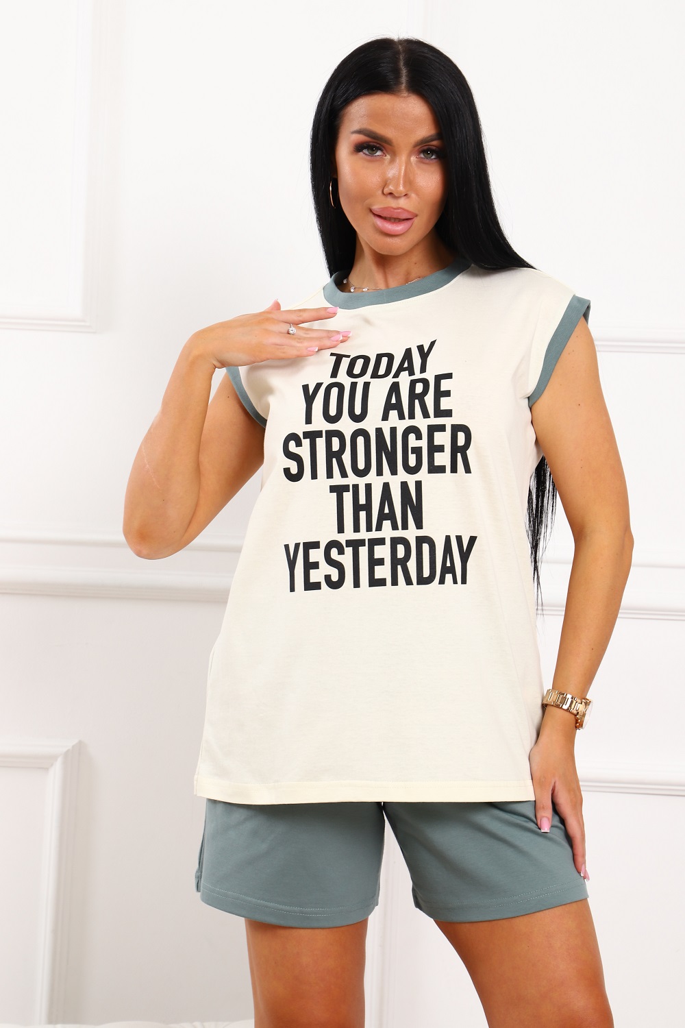 Костюм женский: футболка без рукавов, с принтом на полочке; шорты с боковыми карманами, на эластичном поясе. Комфорт 100% хлопка.
