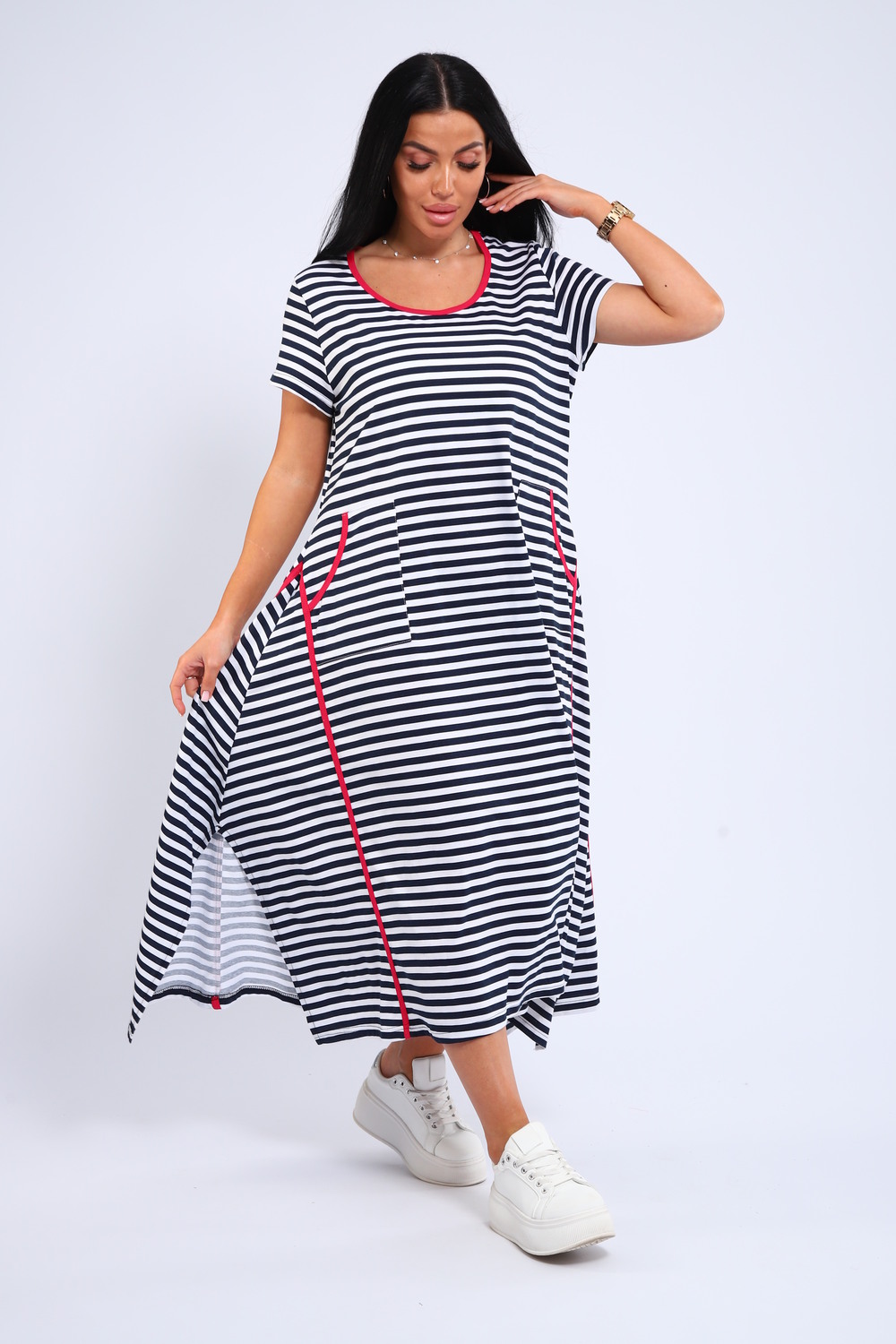 Погрузитесь в мир женственной элегантности с трикотажным платьем больших размеров. Изготовленное из дышащего натурального 100% хлопка, оно обеспечит комфорт и уют в любое время года. Модель оверсайз гарантирует свободу движений и скрывает недостатки. Женское платье с коротким рукавом подходит для повседневных прогулок летом. Лакончиный дизайн с фигурным исполнением низа подола клеш сделает ваш образ стильным и неповторимым. Домашний сарафан полуприлегающего силуэта прекрасный выбор не только в качестве повседневной одежды, но и для дома. Это классическое платье станет вашим любимым нарядом для работы и праздника. Женственное и красивое, оно подходит для торжества и вечернего выхода. Удлиненное домашнее платье будет прекрасно смотреться на беременных и полных дамах. Мягкая, приятная к телу ткань и женственный рисунок сделают нашу летнюю тунику любимой частью гардероба девушек с разным типом фигуры. Она подчеркнёт красоту и станет незаменимым спутником в любой ситуации. Цвет: полоса; Материал: кулирка пенье;кулирка пенье; Состав: хлопок 100%.