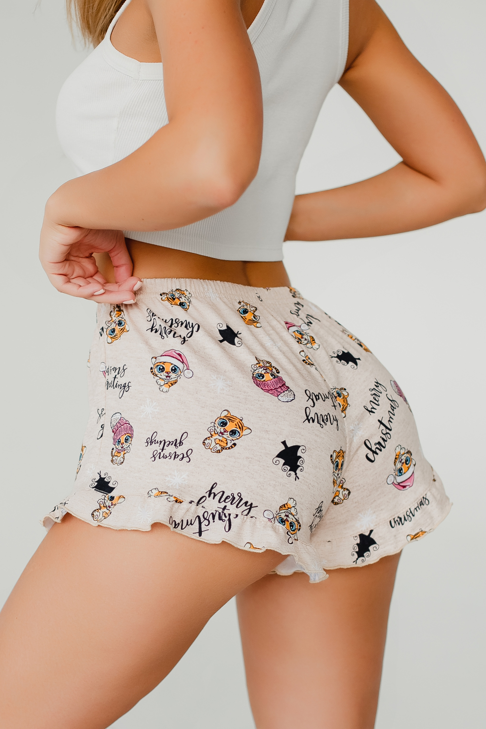 Модель: Шорты женские домашние с рюшей котята кремовый