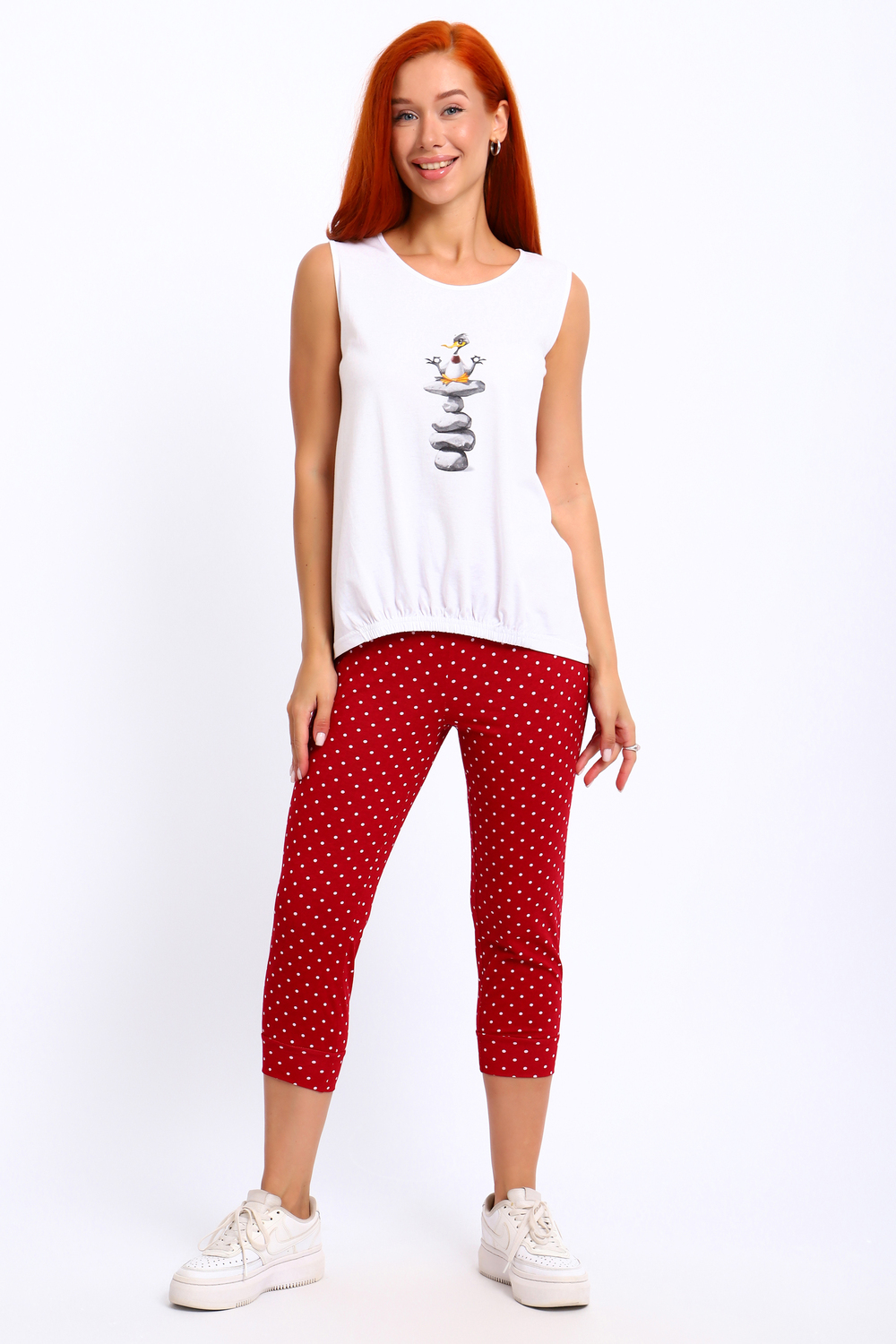 Костюм состоит из футболки и бридж. На бриджах пижамы резинка, снизу футболка декорирована стягивающим швом, а необычный принт поднимает настроение, что освежает образ.