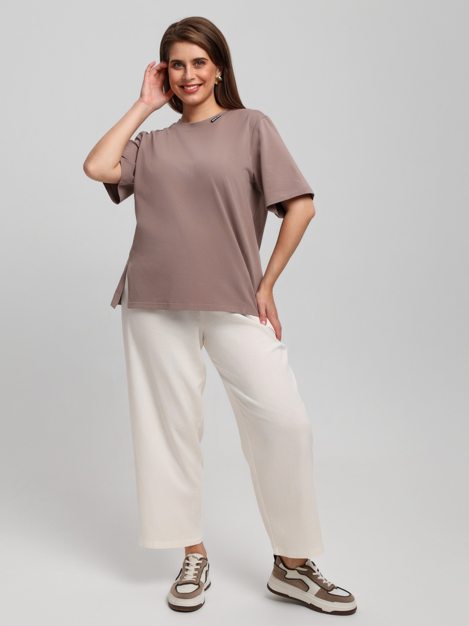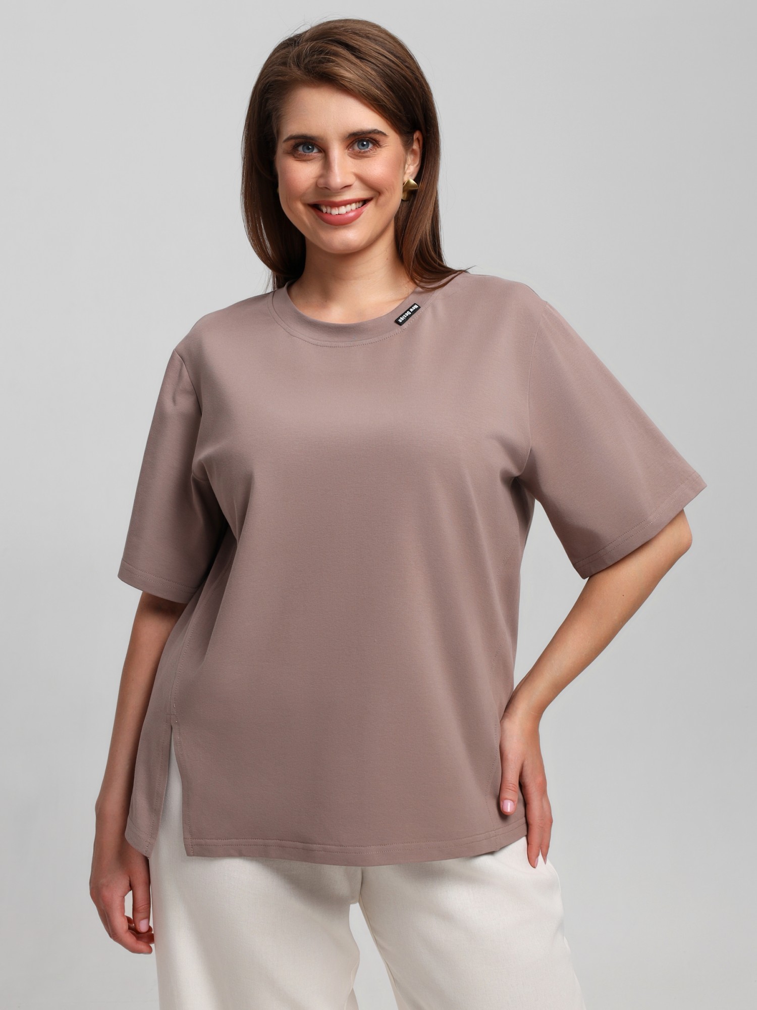 Футболка женская из гладкокрашенного трикотажного полотна «кулирка», свободного силуэта, с боковыми швами, переходящими в рельефы, в правом соединительном шве выполнен разрез. Горловина овальной формы обработана втачной планкой и дополнена декоративным элементом.