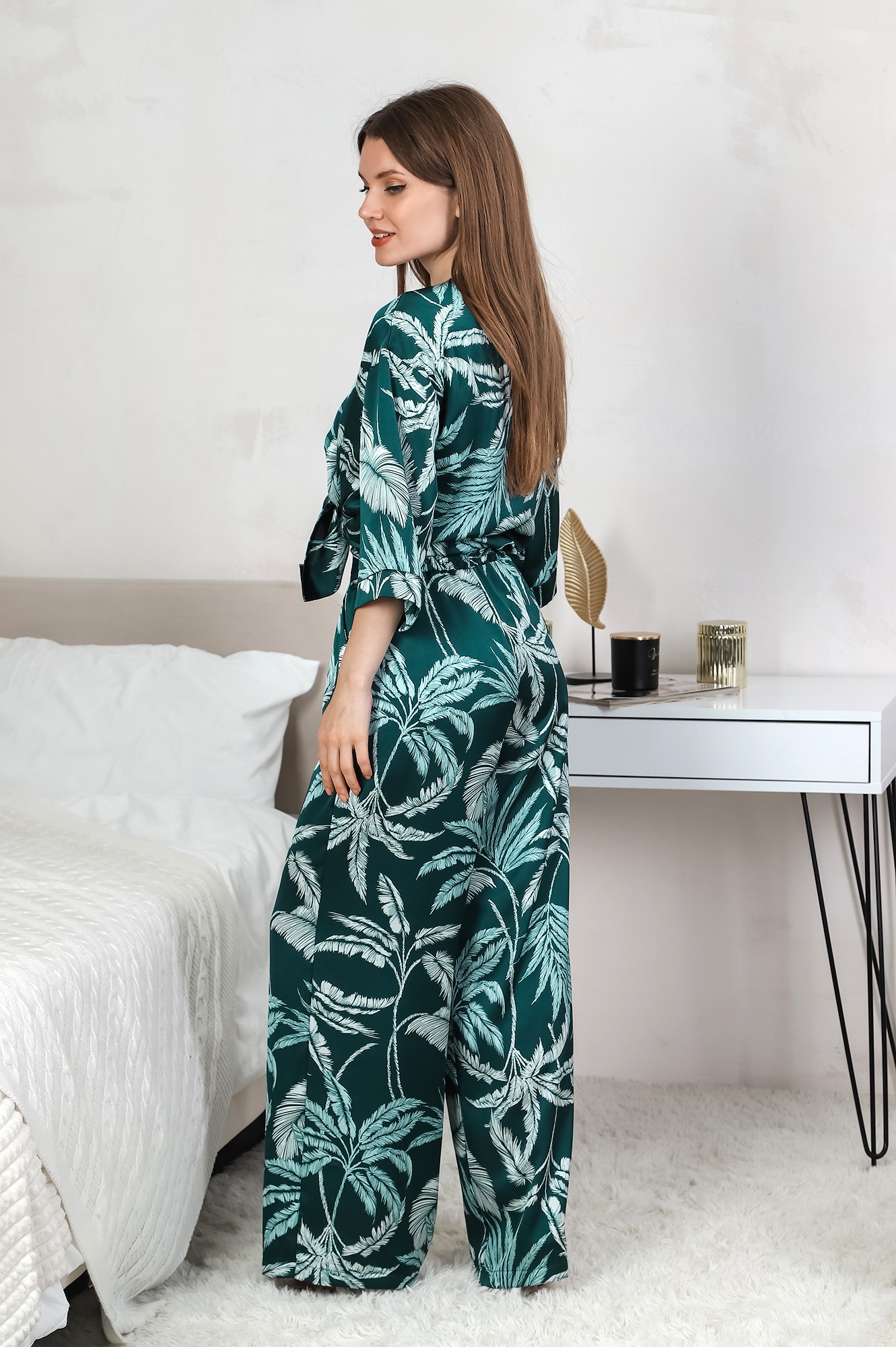 Блуза (рубашка) женская из тканого синтетического полотна с набивным рисунком, свободного покроя, с V- образным вырезом горловины, короткими втачными рукавами, центральной бортовой застежкой на обметанные петли и пуговицы. В боковых швах разрезы, по низу рукавов манжеты, горловина обработана обтачкой.