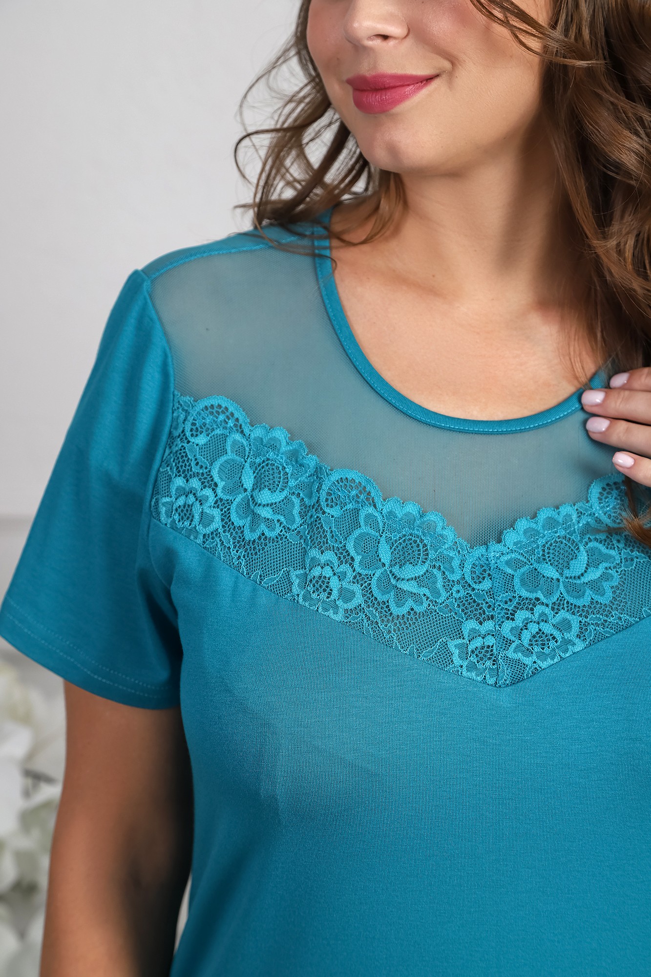 Футболка – с короткими втачными рукавами и горловиной овальной формы, окантованной основным материалом. На полочке и спинке – притачные кокетки v-образной формы, выполненные из полотна «сетка», с настроченными на них кружевными.