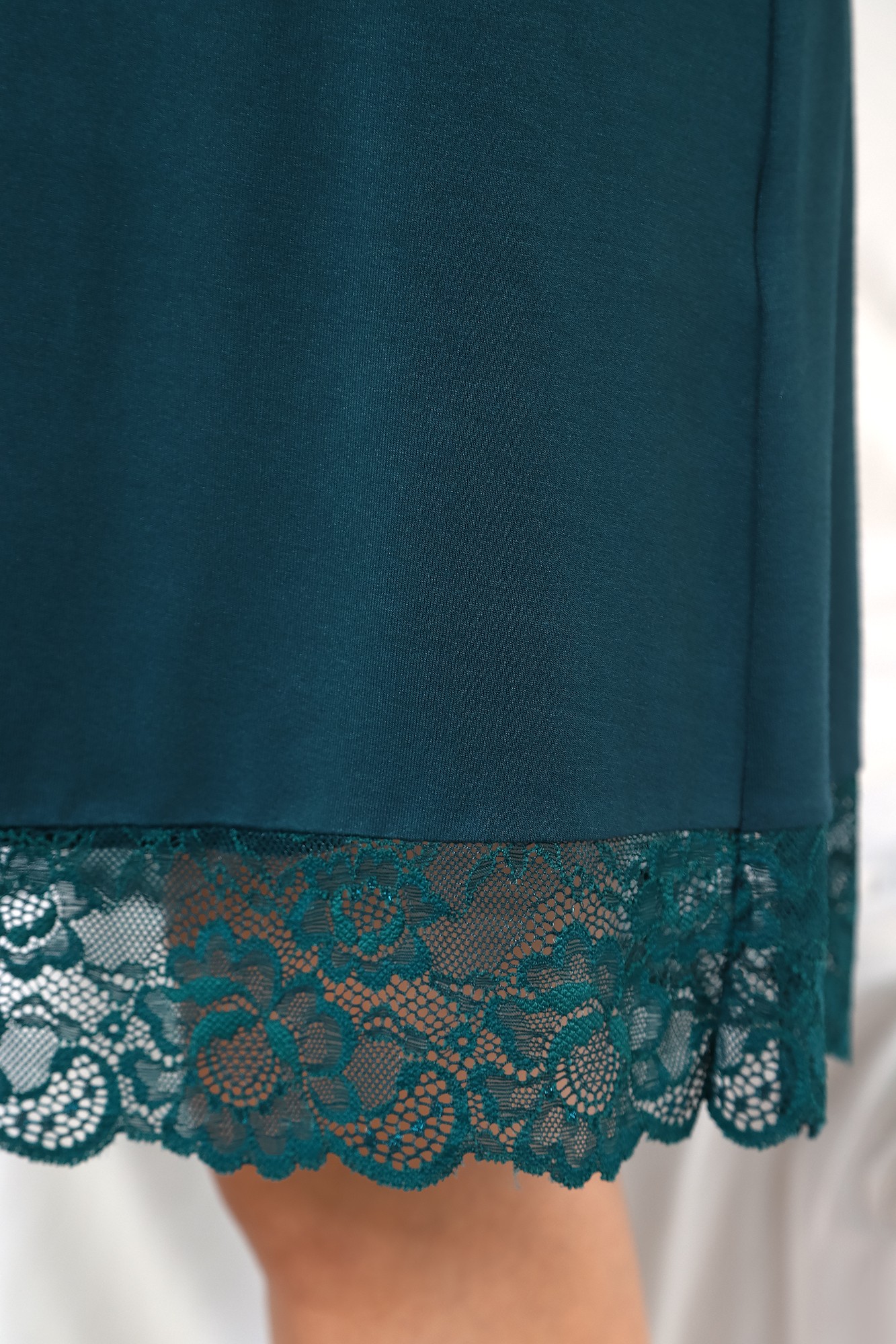 Сорочка молодежная из гладкокрашенного вискозного полотна, слегка расширенная книзу, с горловиной овальной формы, без рукавов на бретелях. Горловина и проймы окантованы основным материалом, детали бретелей выкроены из кружева, низ изделия отделан кружевом.