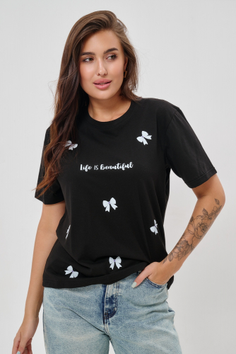 Женская футболка приталенного кроя, изготовлена из мягкого материала кулирки. Элегантная форма с короткими рукавами и аккуратным круглым вырезом создают ощущение лёгкости и свежести образа. Особенное внимание привлекает надпись на груди, украшенная минималистичными маленькими бантиками в сдержанном чёрном цвете. Такая деталь добавляет образу шарма и игривости, оставаясь одновременно простой и изысканной. Футболка легко впишется в гардероб современной девушки, добавив нотку кокетства любому образу.