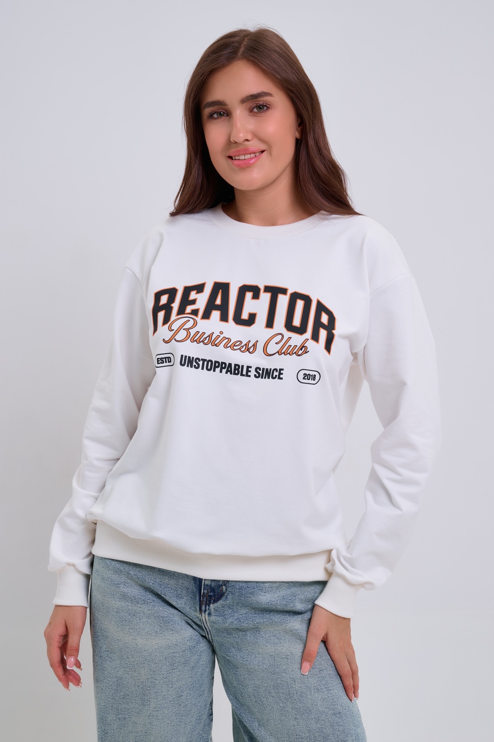 Женский свитшот свободного прямого кроя с круглой горловиной и слегка приспущенными плечами. Спереди нанесён принт в виде надписи REACTOR. Выполнен из мягкого и приятного материала футера 2-х нитки, обеспечивающего дополнительный комфорт и сохранение тепла даже в холодную погоду. Доступен в сдвоенных размерах, что удобно для подбора идеальной посадки. Подходит как для повседневной носки, так и для создания эффектных образов в любом стиле.