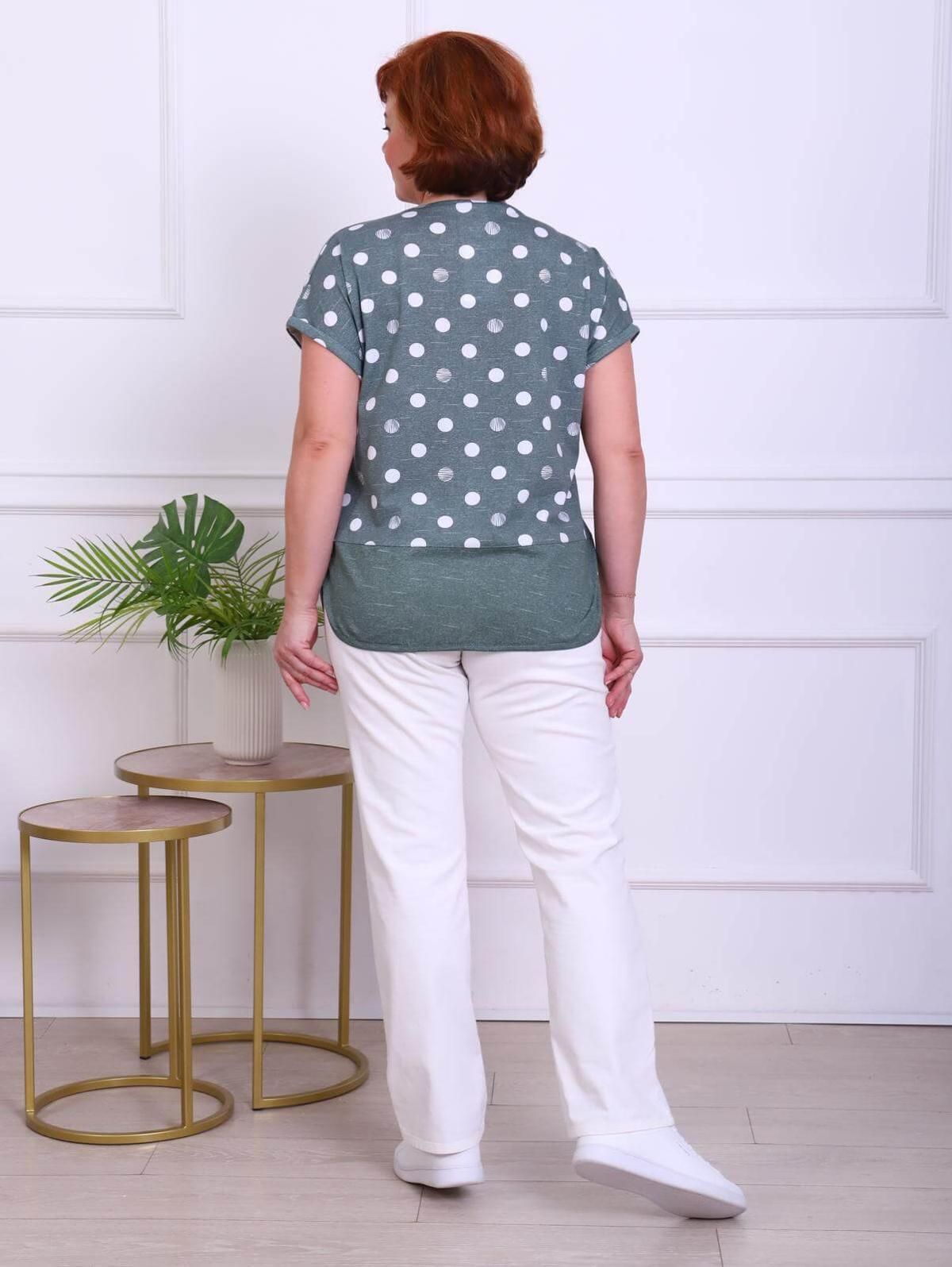 Футболка прямого силуэта с цельнокроеным коротким рукавом. Низ рукавов оформлен манжетами. По низу изделия расположена отделочная деталь с застежкой на пуговицы.