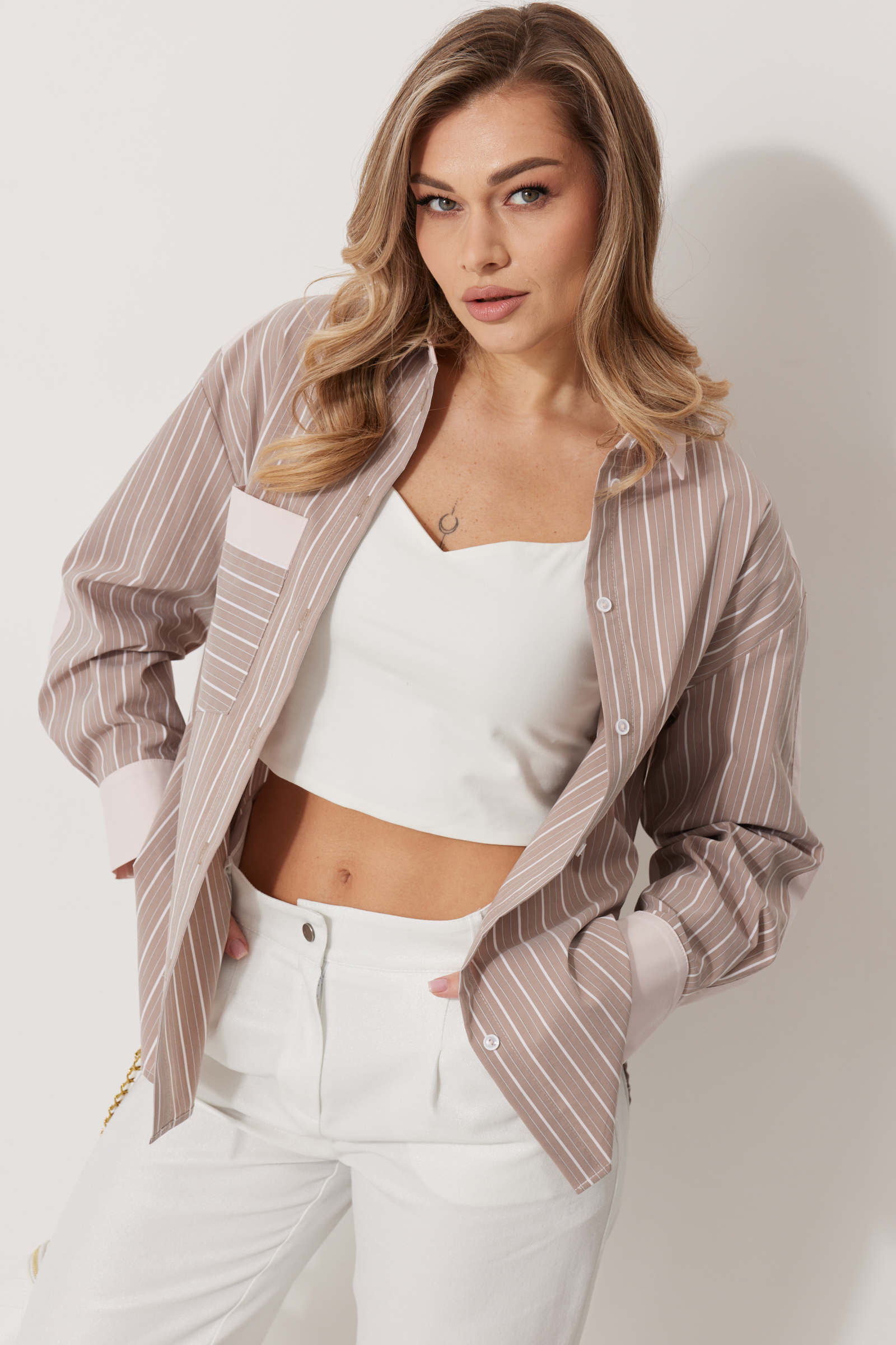 2273/1 блузка 46-54 39 72% хлопок 26% ПЭ 2% эластан Блузка женская прямого силуэта. Полочки из ткани в полоску. На правой полочке настрочен накладной карман с комбинацией тканей. Перед обработан цельнокроеными планками с центральной застежкой на петли и пуговицы. Спинка из ткани в полоски с кокеткой из ткани компаньона. По верхней части спинки заложена бантовая складка. Плечо спущено. Рукав длинный, двухшовный. Одна часть рукава из ткани в полоску, другая из ткани компаньона. Рукав по низу со складкой, обработан широкой притачной манжетой застегивающейся на петли и пуговицы. Разрез рукава обработан притачными отрезными планками. Манжета и притачные планки из ткани компаньона. Низ разноуровневый, закругленной формы. Горловина обработана воротником рубашечного типа с отрезной стойкой из ткани компаньона. Длина спинки изделия 77 см, длина руква от горловины 74 см. 46-54