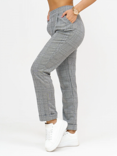 Брюки на поясе с боковыми карманами, задняя часть пояса собрана на резинку.