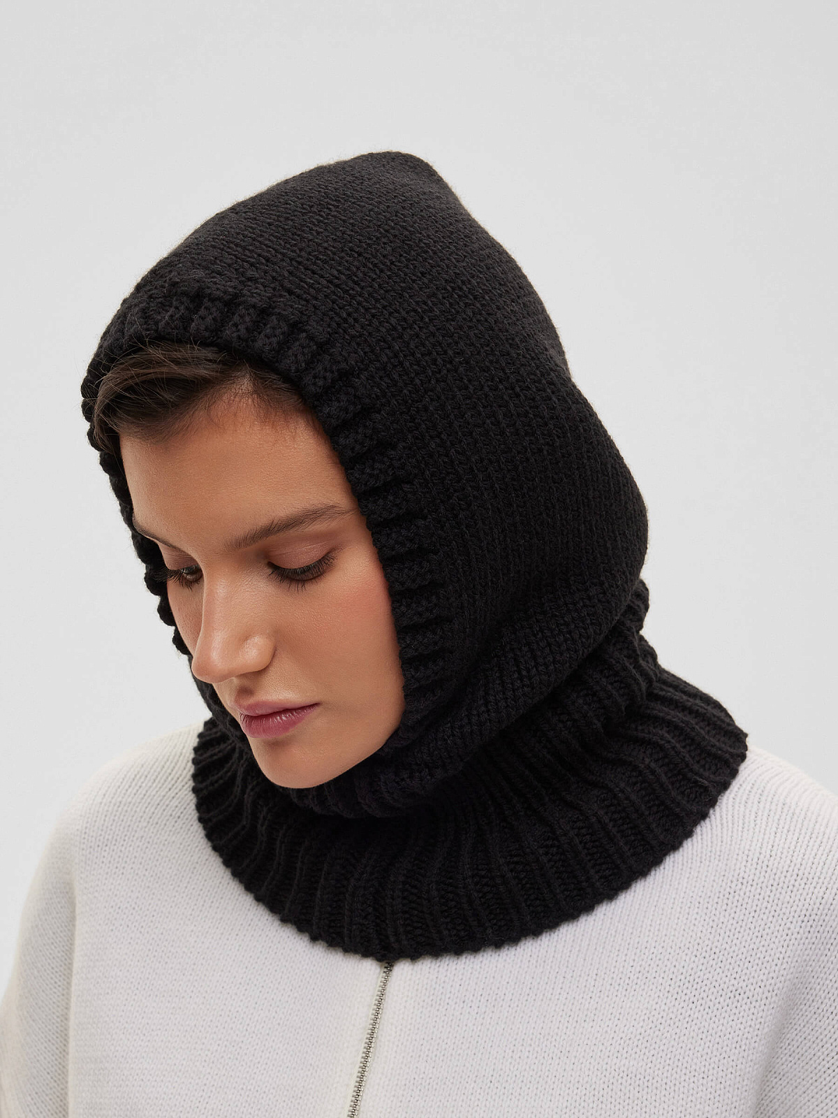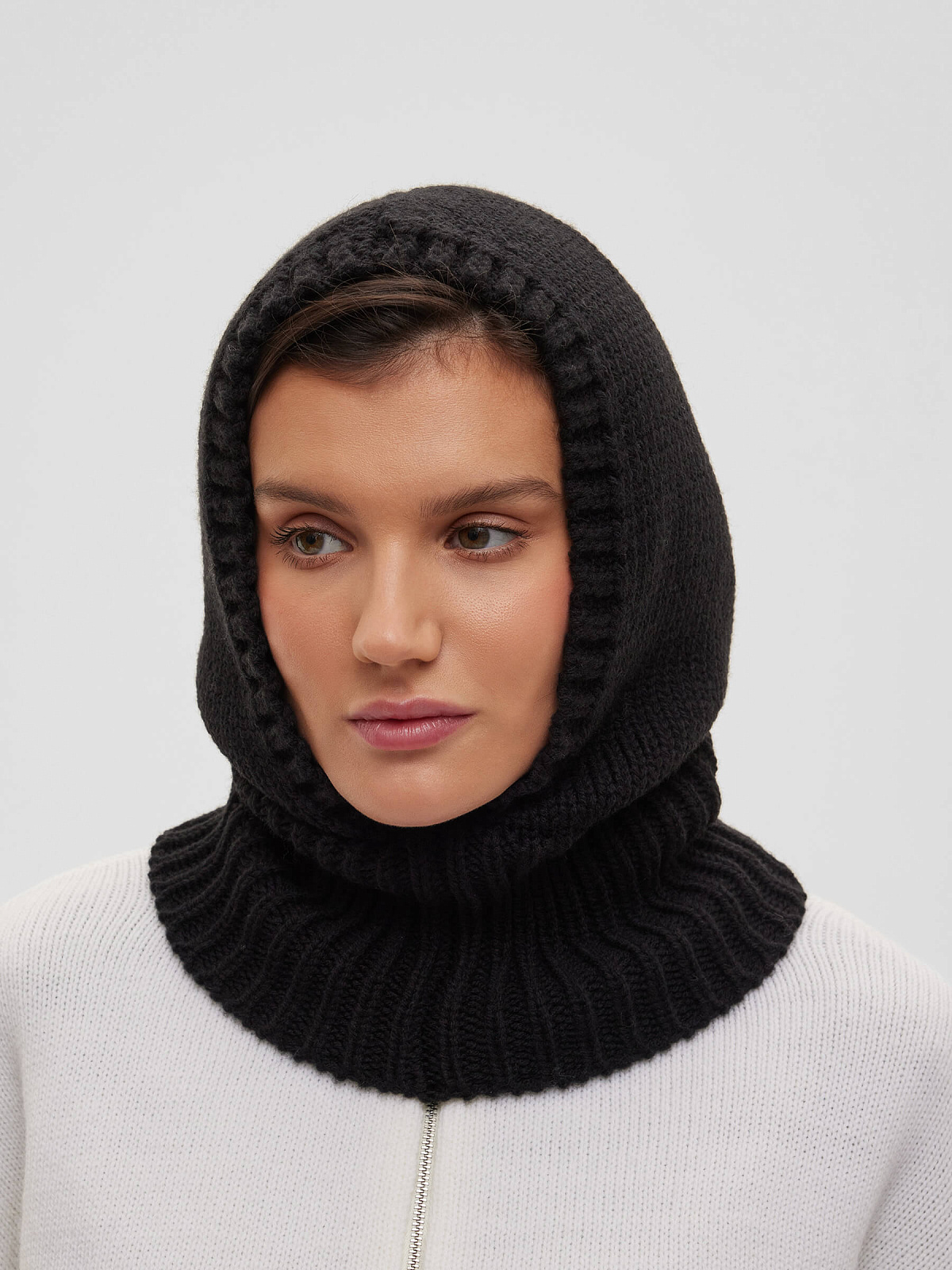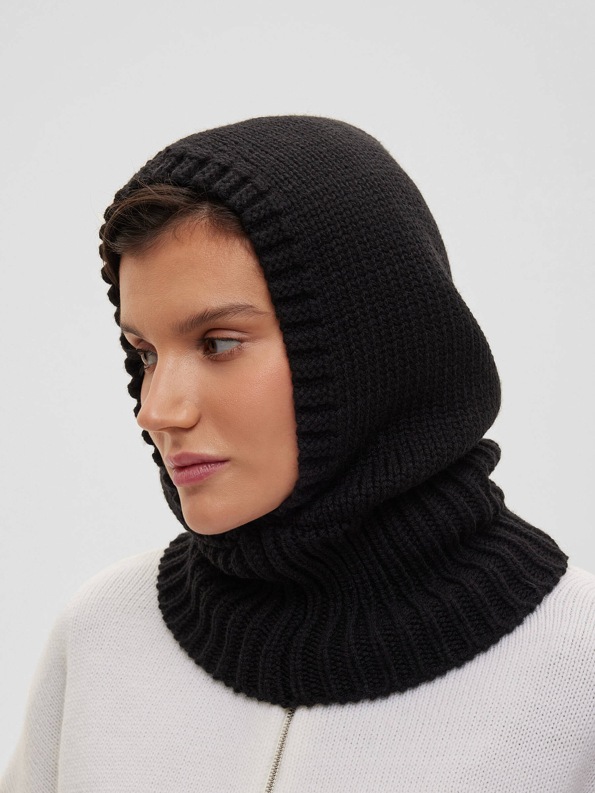Капор из шерсти мериноса гладкой вязки свободной посадки и с резинкой по горловине.