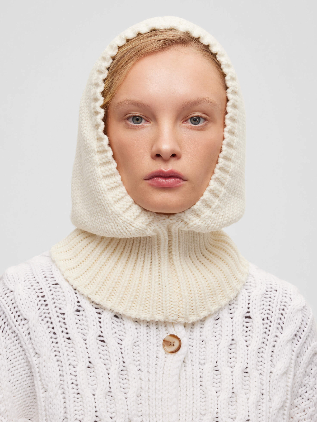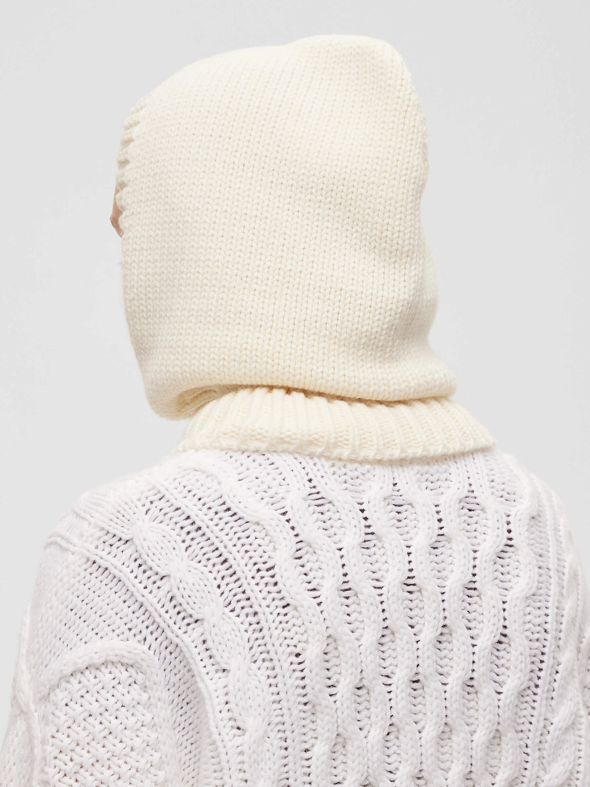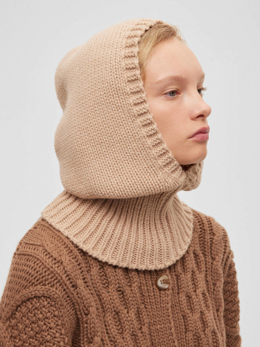 Капор из шерсти мериноса гладкой вязки свободной посадки и с резинкой по горловине.