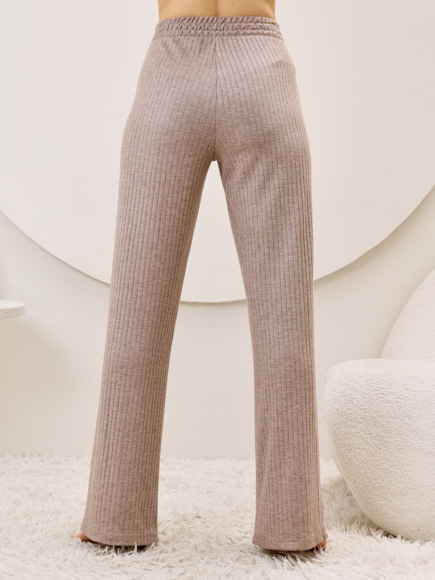 Брюки – женские из гладкокрашенного трикотажного фактурного полотна в «рубчик» с добавлением ангоры, полуприлегающего силуэта, длинные, слегка расширенные книзу, на притачном поясе с эластичной тесьмой внутри.