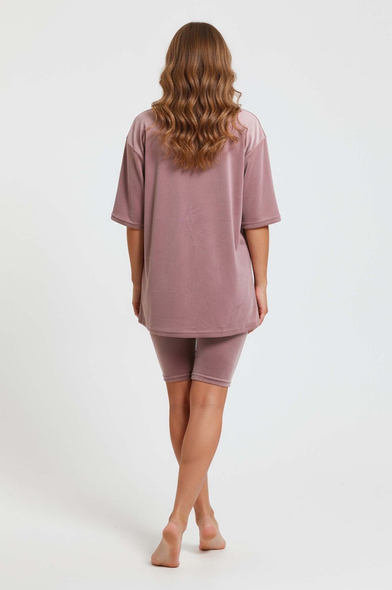 Костюм из гладкокрашеного трикотажного полотна «велюр стрейч», состоящий из футболки и леггинсов. Футболка – удлиненная, свободного покроя, со спущенной, линией плеча, короткими втачными рукавами, горловиной овальной формы, обработанной втачной планкой.Леггинсы – длиной до колен, с эластичной тесьмой по талии.
