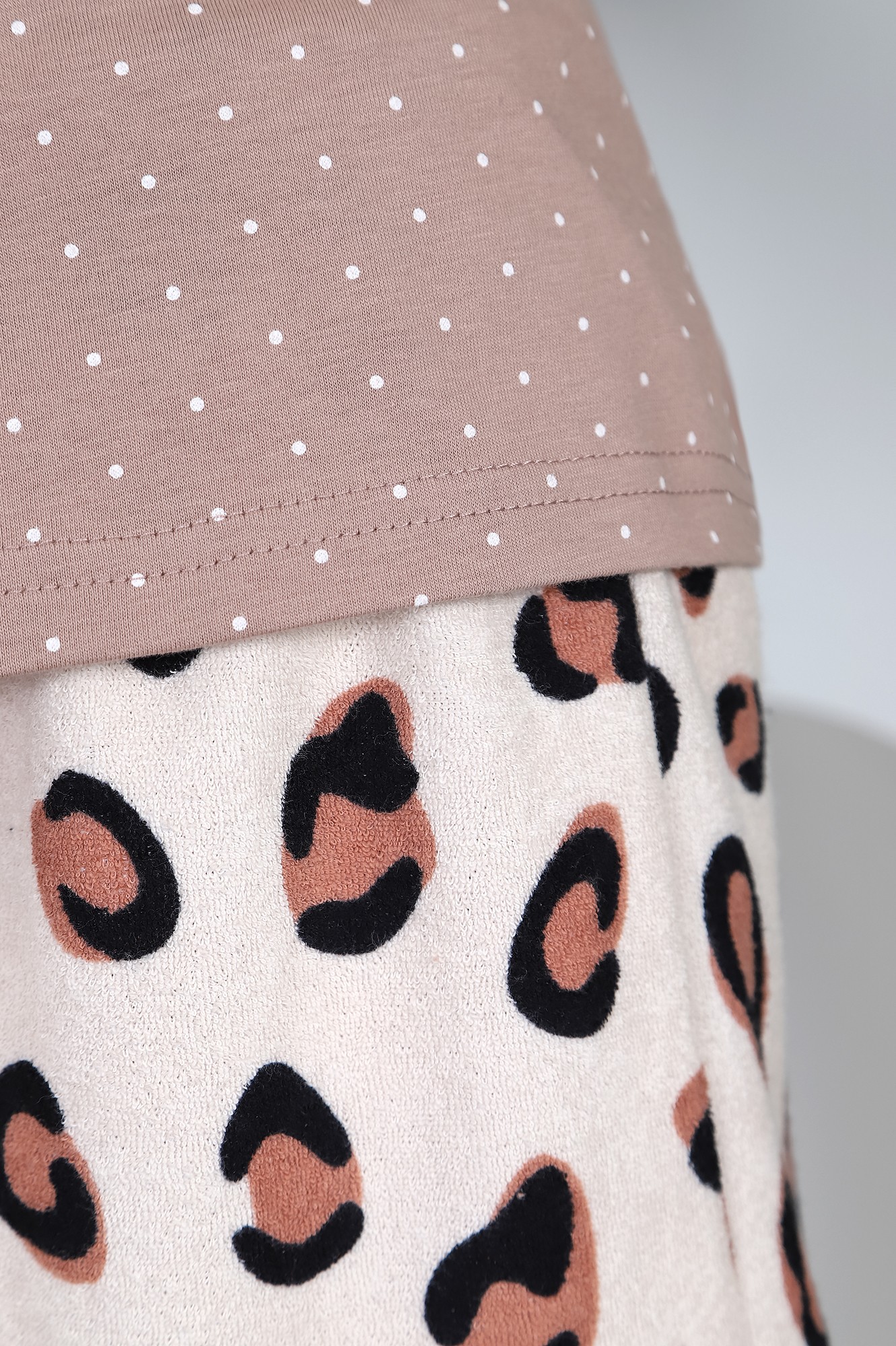 Пижама из трикотажного полотна «кулирка» в комбинации с трикотажным полотном «махра» с набивным рисунком в единой цветовой гамме, состоящая из футболки и шорт. Футболка – из гладкокрашеного полотна «кулирка», классического покроя, с короткими цельнокроеными рукавами, горловиной v- образной формы, окантованной основным материалом. На полочке принт, выполненный в технике «шелкографии».Шорты – из полотна «махра», средней длины, расширенные книзу с эластичной тесьмой по талии.