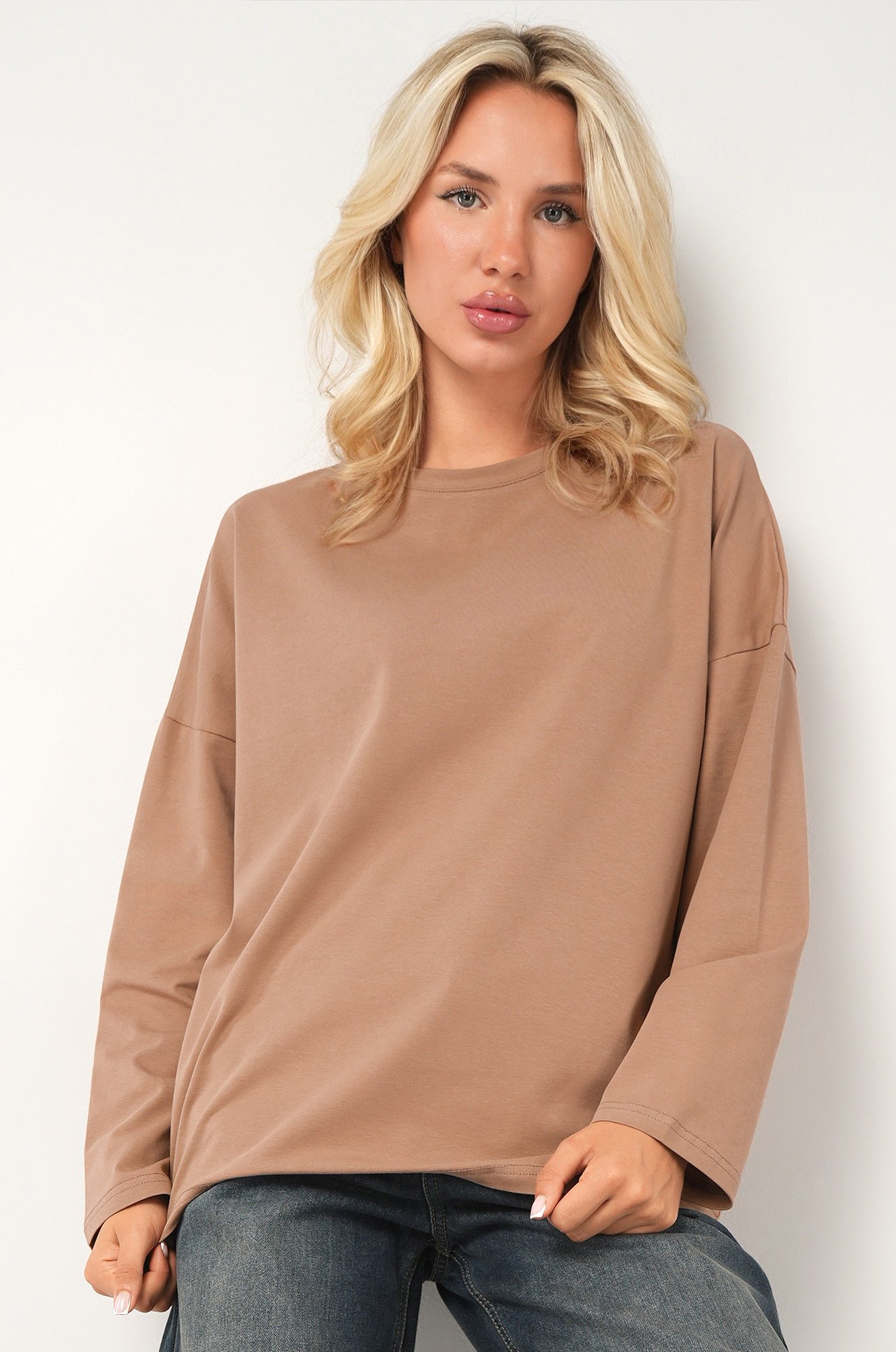 Женский лонгслив оверсайз создан, чтоб..показатьы дарить свободу и комфорт в любую погоду. Однотонный бежевый лонг смотрится стильно и сдержанно, а хлопковый трикотаж делает его невероятно приятным к телу.