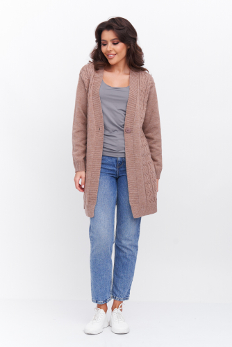 Модель имеет застёжку на пуговицу. Полочки выполнены структурным узором "косы".  Модель отлично подойдет к платью, юбке и брюкам.  Отличное изделие для прохладного времени года для повседневных прогулок на улице или дополняющая деловой стиль на работу в офис или институт. джинс
