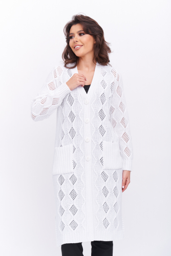 Женский вязаный ажурный кардиган на пуговицах с длинным рукавом. Летняя накидка выполнена из высококачественной пряжи с составом 50% хлопок 50% ПАН. Кардиган свободно сидит на фигуре,  имеет округлую горловину, что придаёт модели выраженную женственность.  Стильный, однотонный, ажурный кардиган станет незаменимой вещью в Вашем гардеробе в солнечноую погоду летом или дополнит вечерний образ для выхода на различные мероприятия.