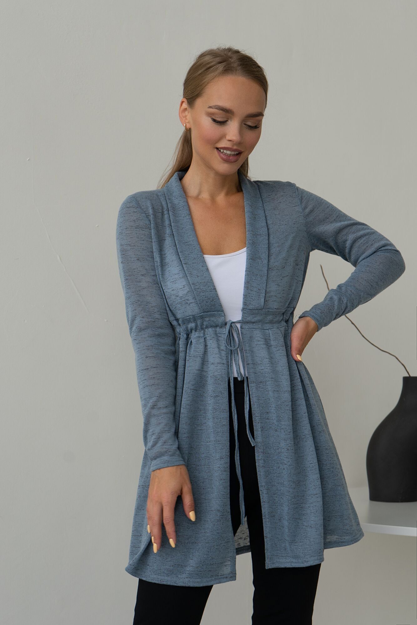 Однотонный кардиган широкого кроя идеальный выбор для дам в положении или желающих скрыть излишние объемы бёдер и ног. Модель с кокеткой завязывается на шнурок. Прекрасно подчёркивает линию груди и декольте избегая нижних объёмов. Удлиненный наряд может быть использован как накидка, легко дополнит деловые комплекты, оттенит цветную рубашку, водолазку или топ. Идеальная вещь на каждый день сохранит тепло и комфорт.44 размер-ОГ-80, ОТ-78, ДИ-79, ДР-55 42 размер- ОГ-79, ОТ-77, ДИ-78 ДР-54,46 размер-ОГ-82, ОТ-79, ДИ-80, ДР-56 48 размер-ОГ-83, ОТ-80, ДИ-81, ДР-57