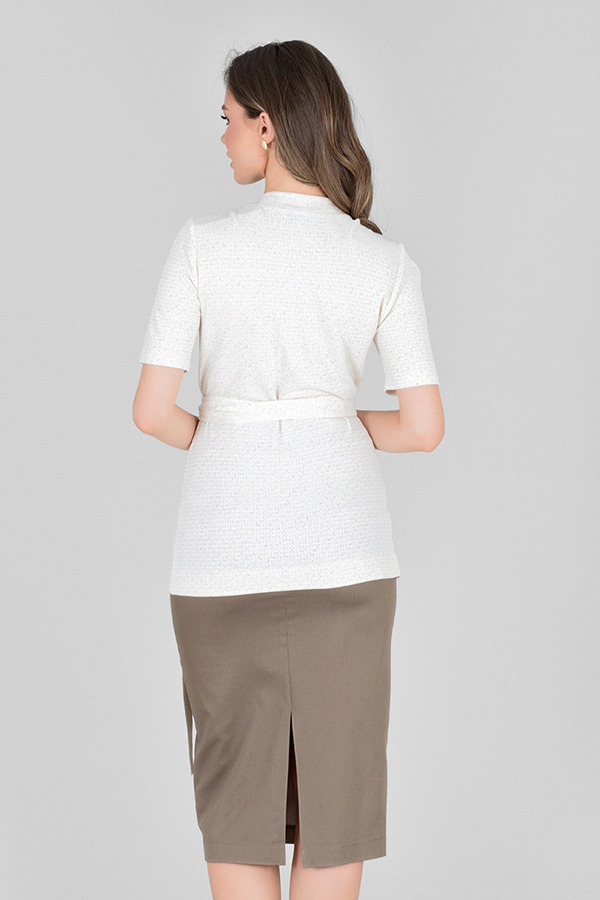 Кардиган из фактурного эластичного полотна. Полуприлегающий силуэт с запахом. Короткий втачной рукав. Вырез горловины оформлены бейкой из основной ткани, переходящий в пояс.