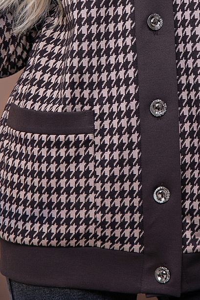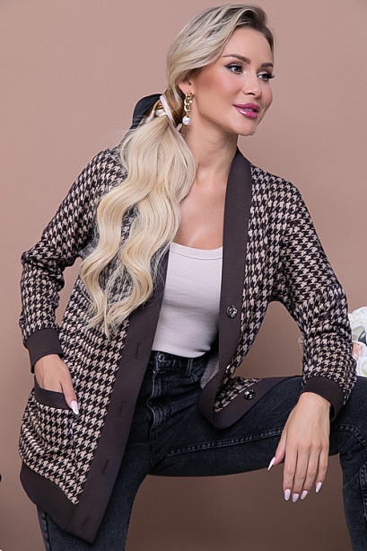 Кардиган свободного силуэта из жаккардового трикотажного полотна в клетку с однотонной отделкой.