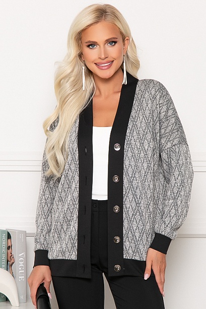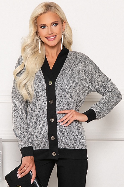 Кардиган из трикотажного полотна с контрастной отделкой и застежкой на петли и пуговицы по центру.