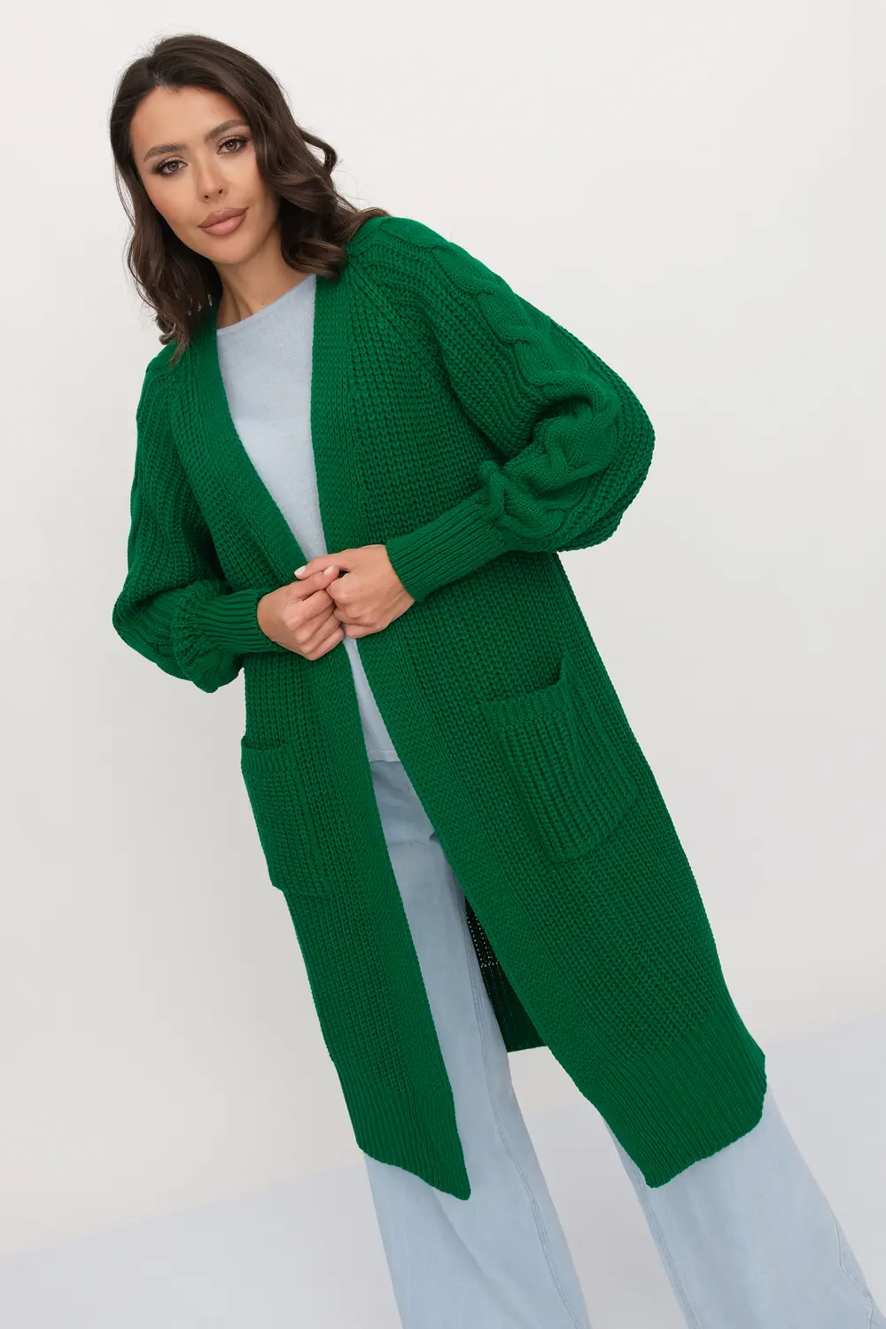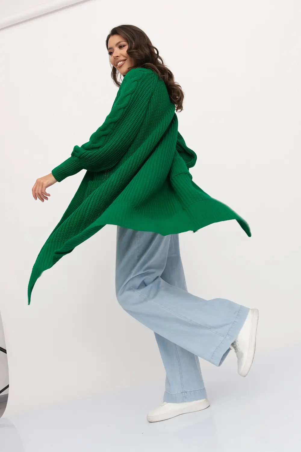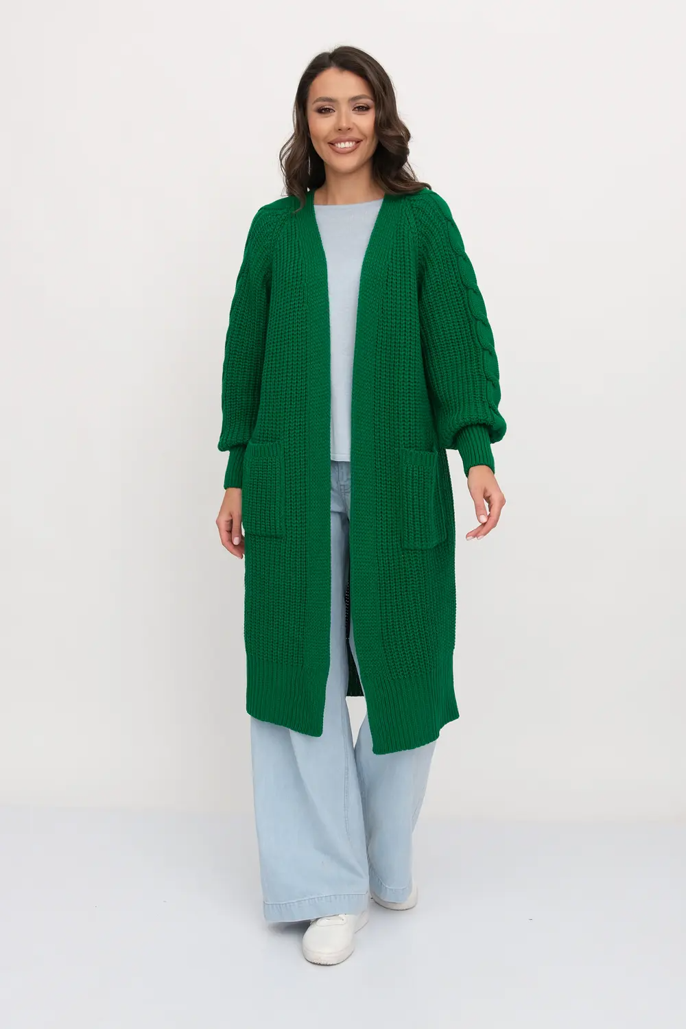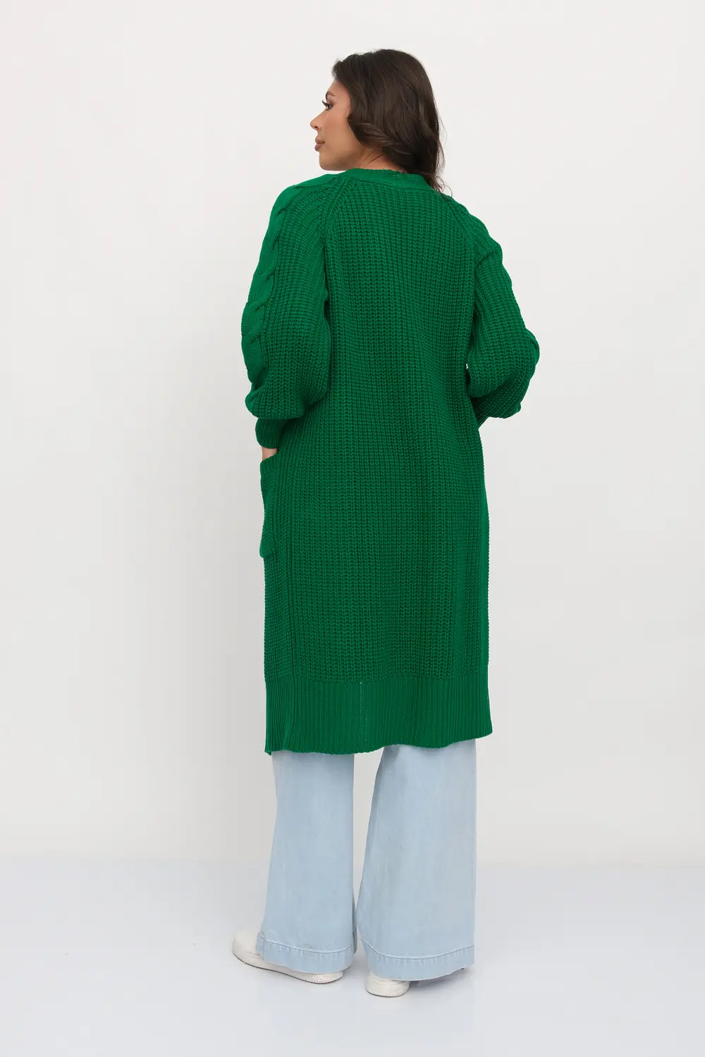 Кардиган женский вязаный свободного силуэта. V-образный вырез. Рукав-реглан длинный. По низу рукава и изделия эластичная резинка. Кардиган выполнен объемной вязкой "французская резинка".  Карманы декорированы узором "косы". зеленый