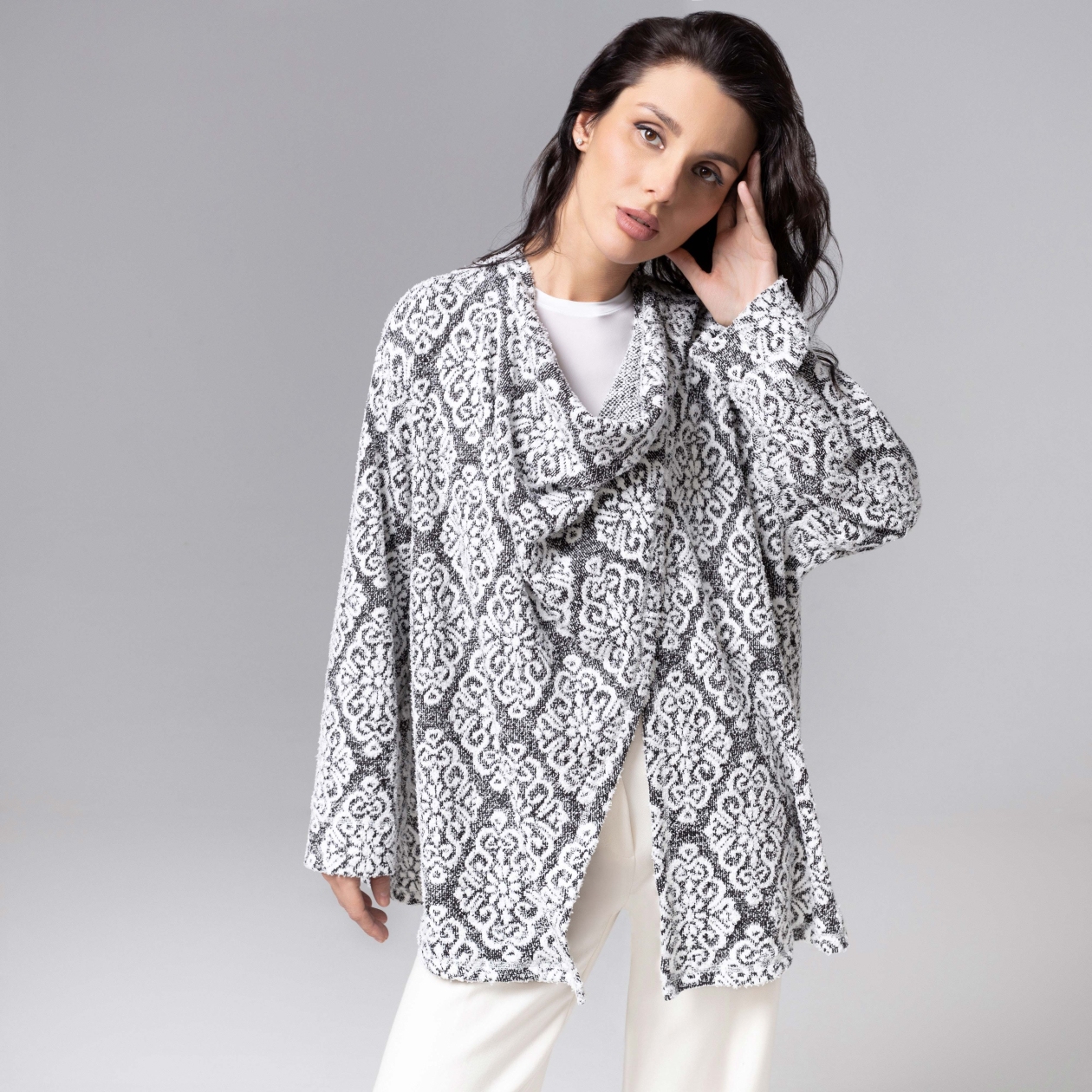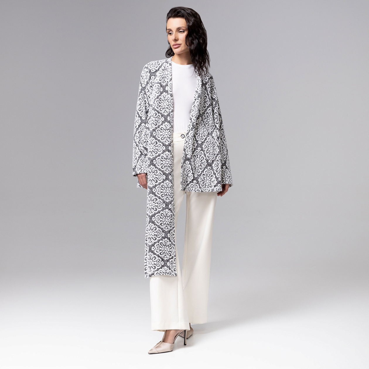 Этот кардиган – как два персонажа в одном: снаружи – деловая серьёзность, внутри – уютный плед для душевных разговоров. Меняйте сторону, как настроение. Вот он – настоящий «Секрет уверенности». Кардиган двустороний. Сложный конструктивный замысел позволяет создавть вариации образов. Многослойная фактура ткани, сочетает мягкость и эластичность высококачественного трикотажа, а крой позаботился о безупречной посадке. Идеально подойдет на любой тип фигуры.Кардиган one size. До 52 размера.