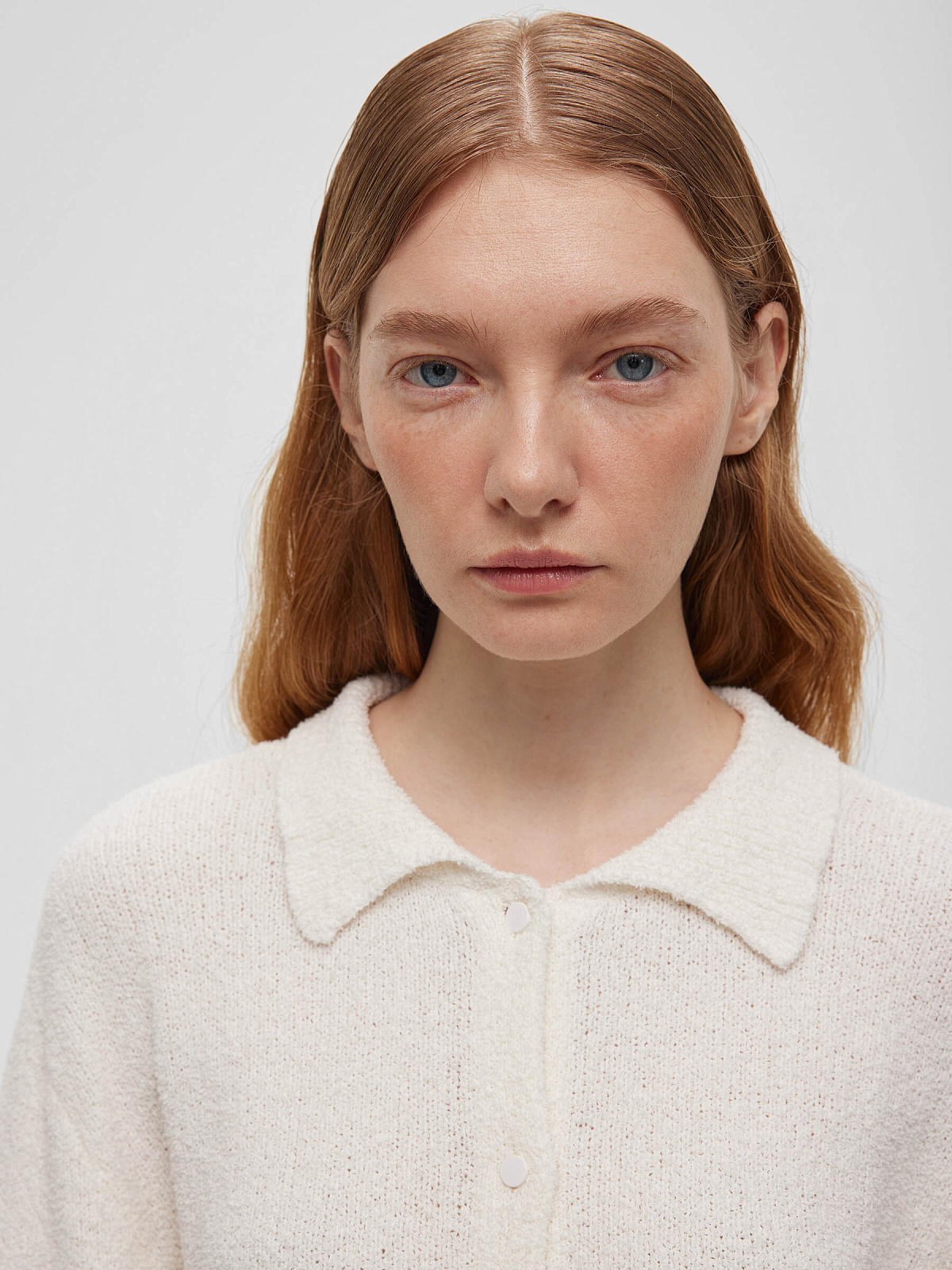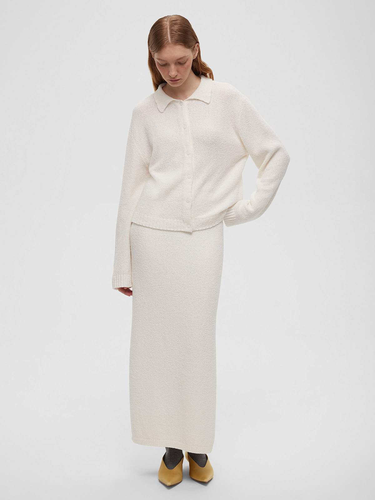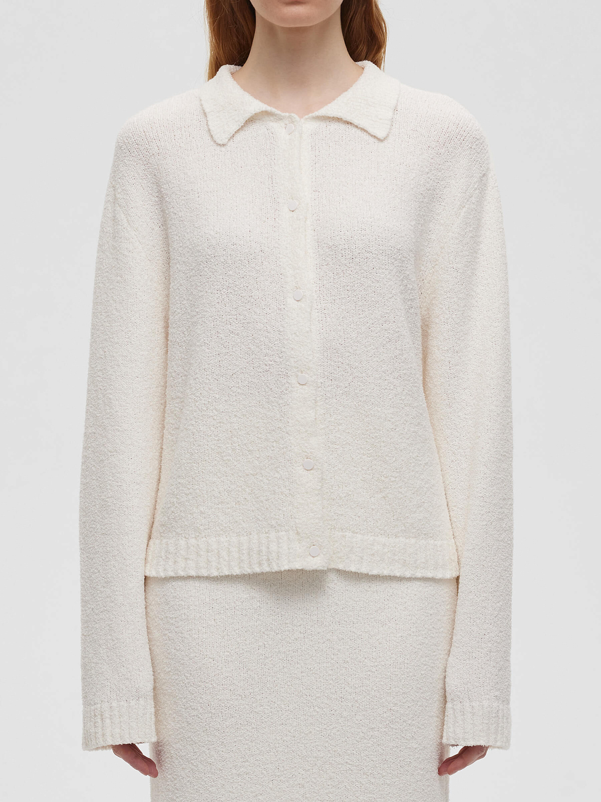 Кардиган свободного кроя. Изготовлен из фактурной пряжи на хлопковой основе с эффектом букле.