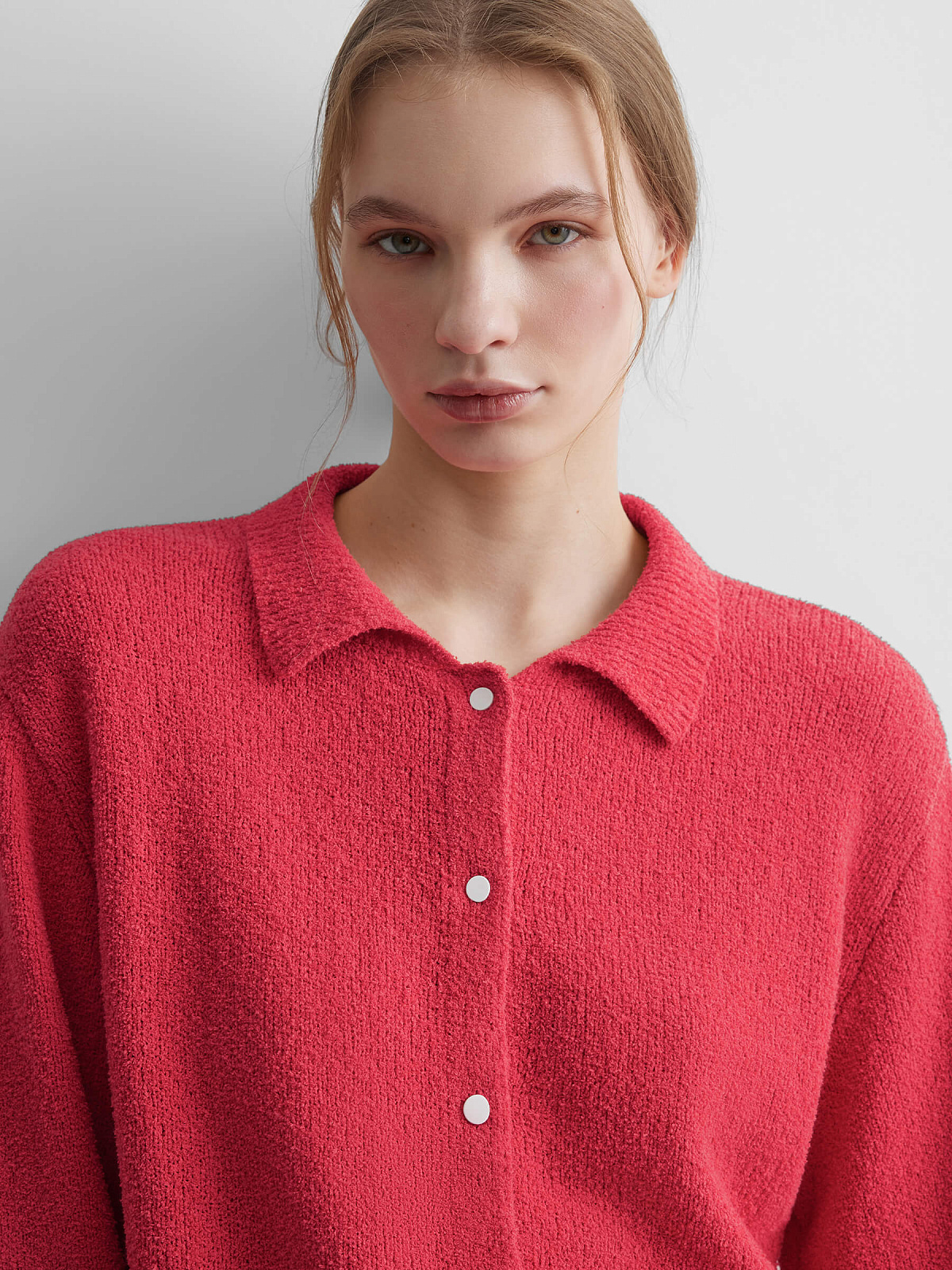 Кардиган свободного кроя. Изготовлен из фактурной пряжи на хлопковой основе с эффектом букле.