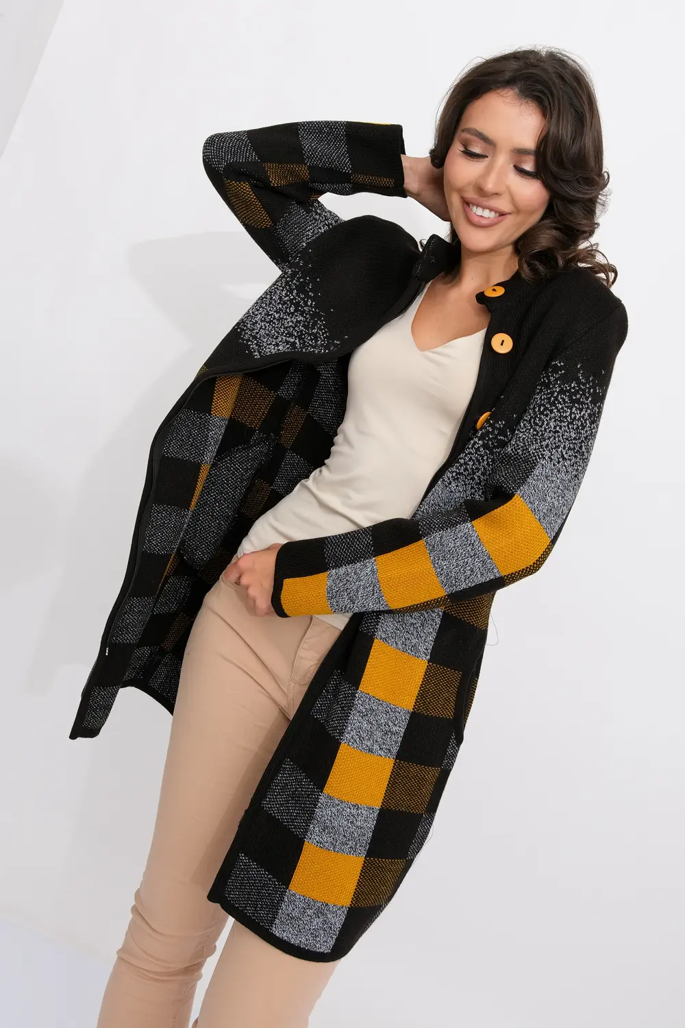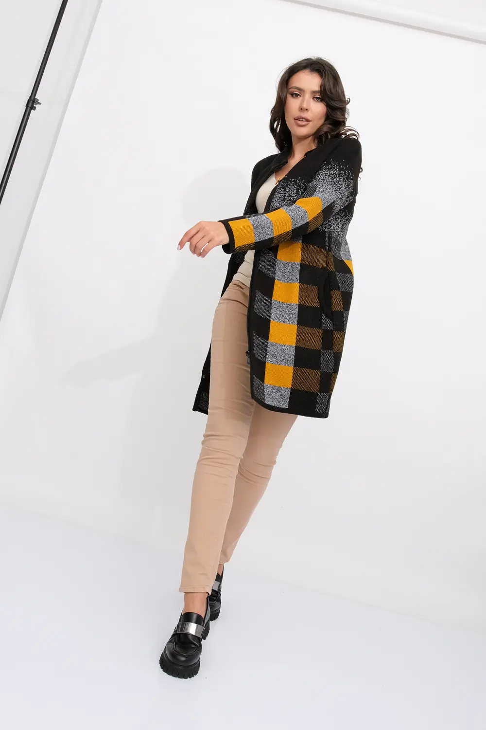 Женский эффектный вязанный кардиган с ассиметричным бортом. Воротник стойка. Кардиган на молнии по всей длине, с декоративными застежками- пуговицами по верху изделия. Рукава втачные длинные. Два прорезных кармана. Жаккардовое переплетение образует геометрический рисунок.  Кардиган согреет вас в прохладный день и подарит ощущение невероятного комфорта. горчичный микс