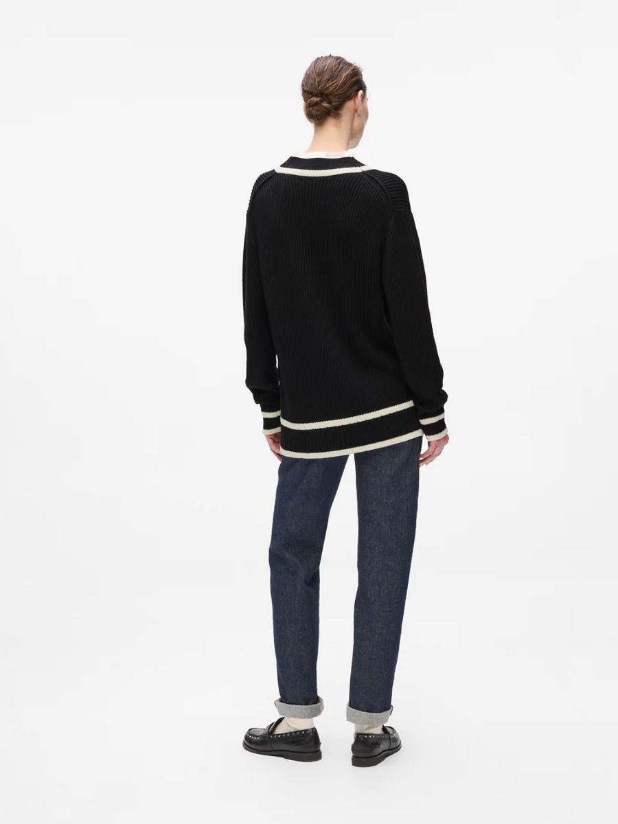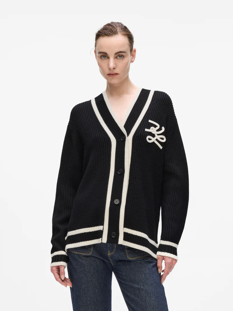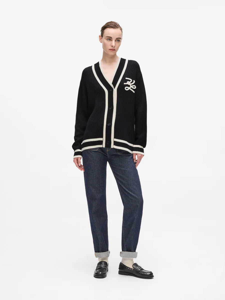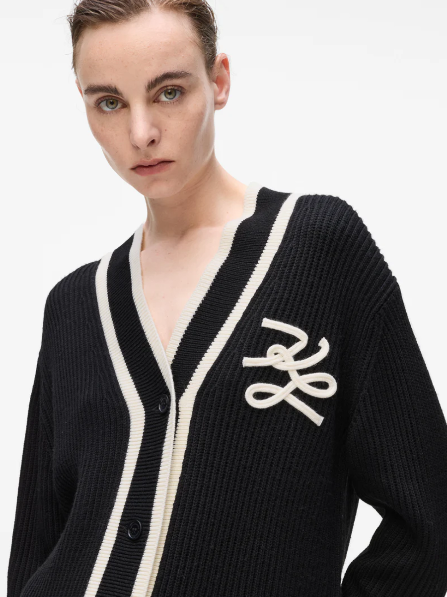 Этот кардиган ребристой вязки с отделкой Karl, сохраняющий тепло, украшен эффектной вышивкой на груди и контрастной окантовкой.