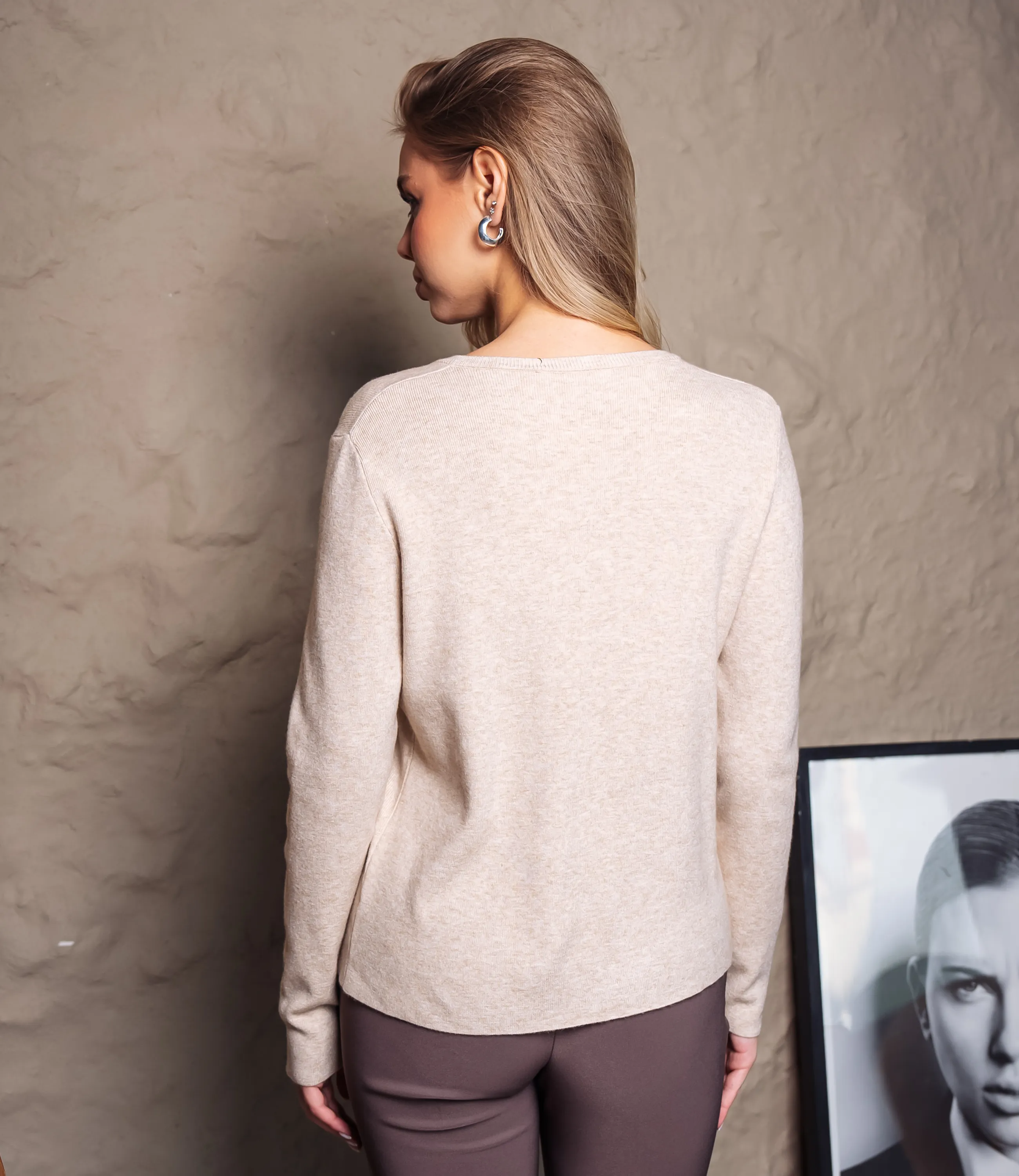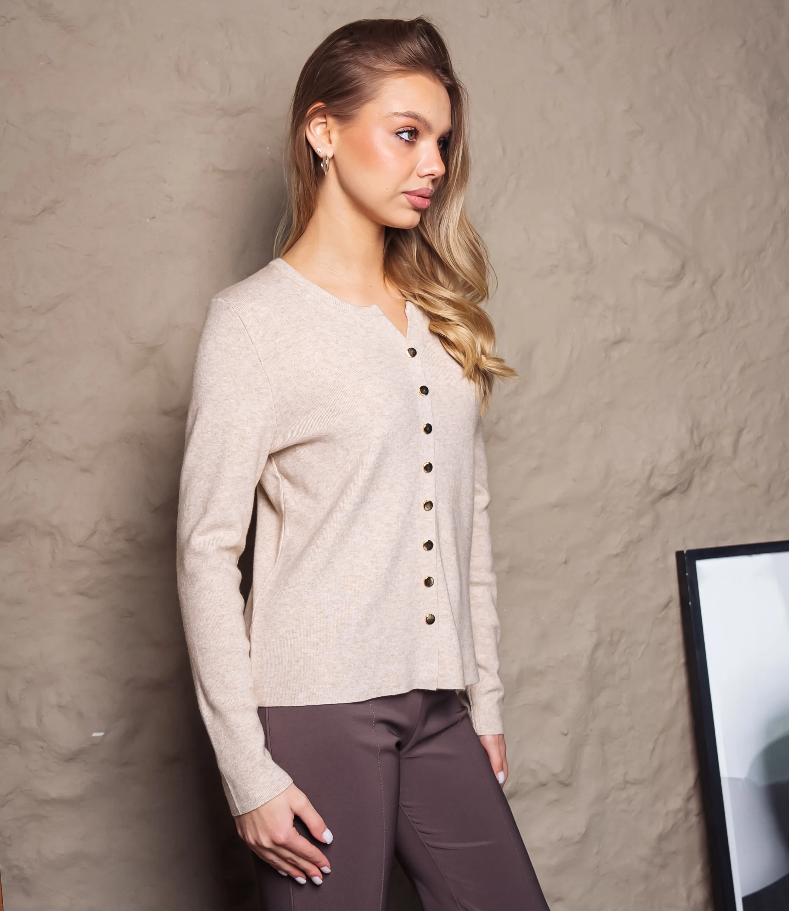 Кардиган — это часть гардероба, которая подчёркивает женственность и утончённость каждой покупательницы. Классический прямой кардиган средней длины со свободной, но аккуратно сидящей линией плеч и плавным ниспадением по корпусу, неглубоким круглым вырезом с небольшим V‑образным вырезом в центре и узкой обработанной кромкой, центральной планкой с рядом небольших круглых пуговиц, равномерно расположенных по всей длине переда, чуть несимметричной нижней кромкой без широкой резинки, длинными рукавами прямого кроя, слегка зауженными к запястью и с ровными манжетами без выраженной резинки, отсутствием внешних карманов и наличием небольшой декоративной металлической бирки на груди. Для пошива использована ткань 65% хлопок, 30% полиэстер, 5% эластан: хлопок обеспечивает комфорт и приятные тактильные ощущения, полиэстер придаёт прочность и стойкость цвета, а эластан гарантирует идеальную посадку и сохранение формы. Трикотаж лёгкий, но плотный, не теряет внешнего вида после множества стирок, цвета насыщенные и соответствуют фотографиям в карточке товара. Для оптовых закупщиков это стабильная и востребованная позиция с высокой оборачиваемостью: универсальный крой упрощает формирование размерного ряда, качественная отделка снижает процент рекламаций, а стильный, нейтральный дизайн легко интегрируется в разные ценовые категории. Рост модели 168 см., 89-63-90.