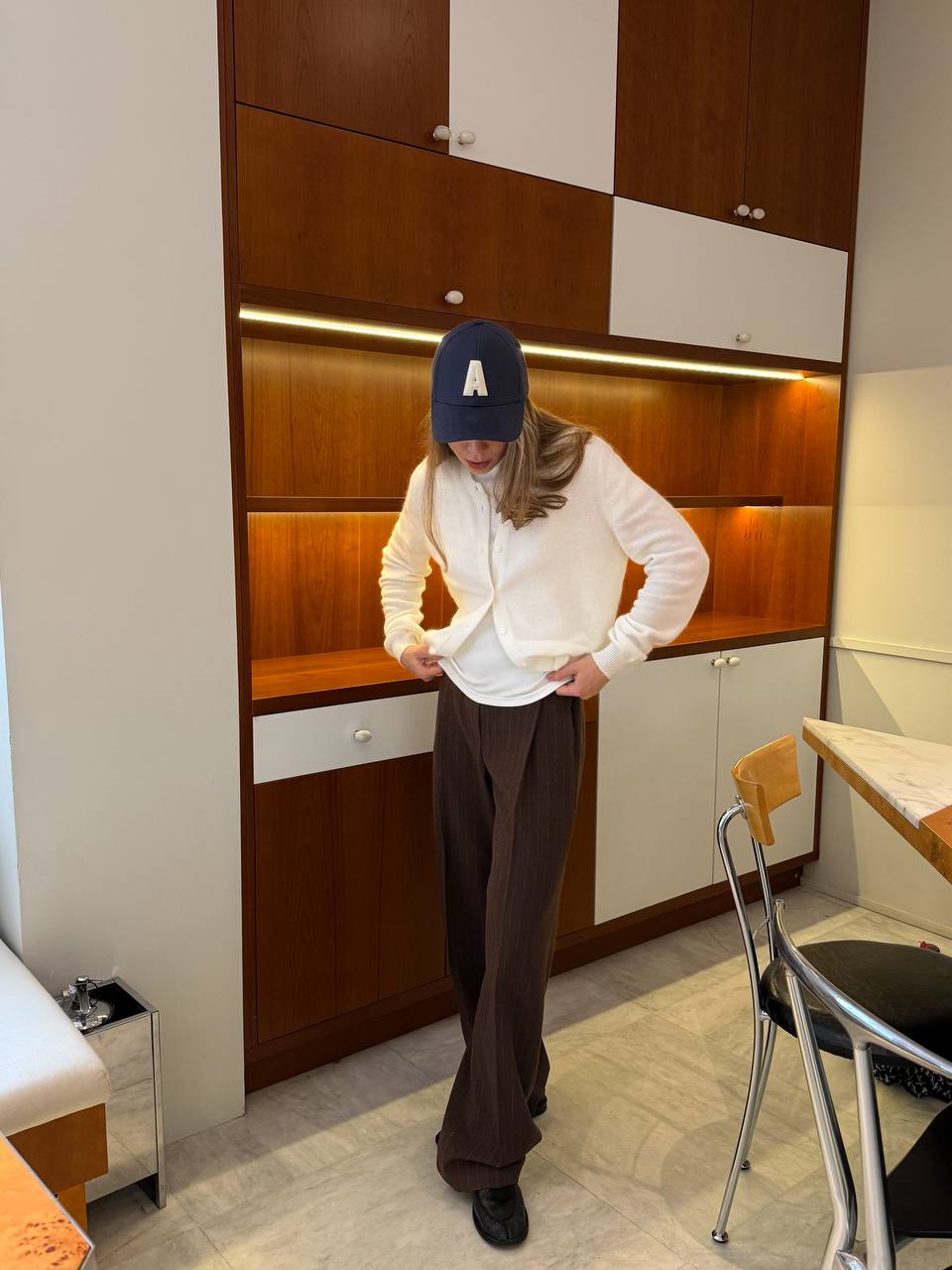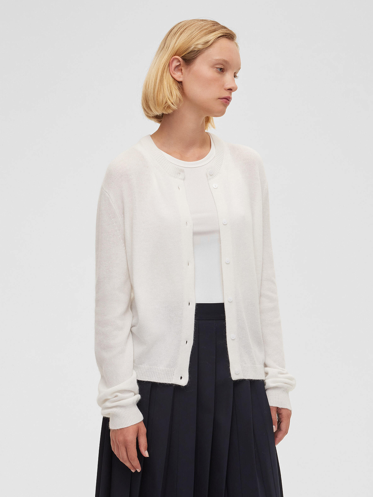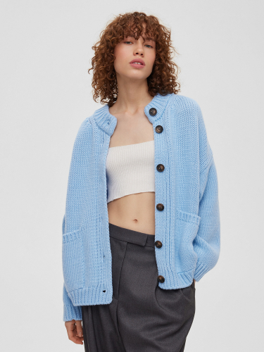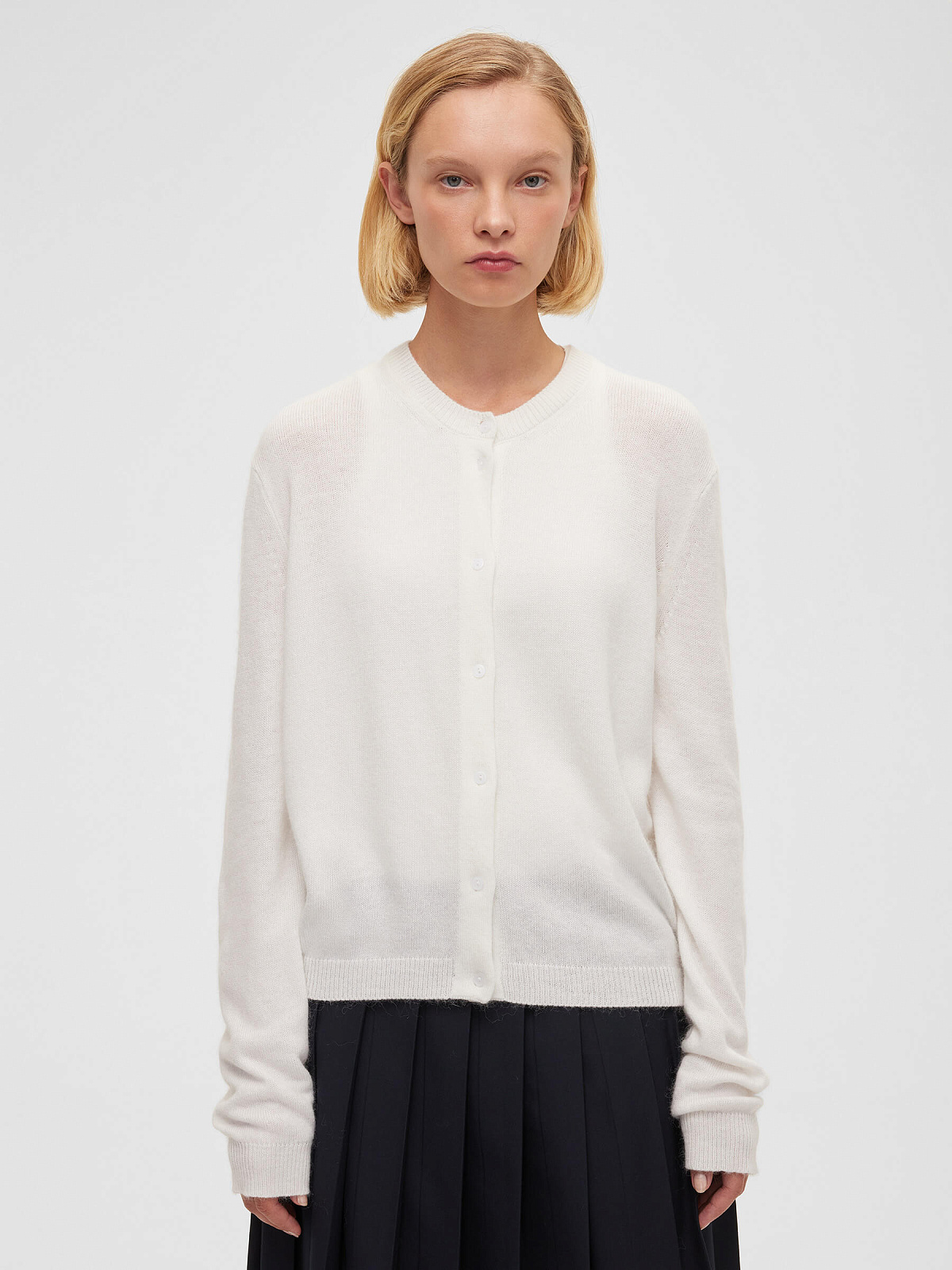 Кардиган прямого кроя с застежкой на пуговицы по переду и круглым вырезом горловины. Изготовлен из смесовой пряжи  улучшенных свойств. Комбинация пуха ангорского кролика и тонкой шерсти в составе создают текстуру с характерным ворсом. Тонкая вязка 12 класса.