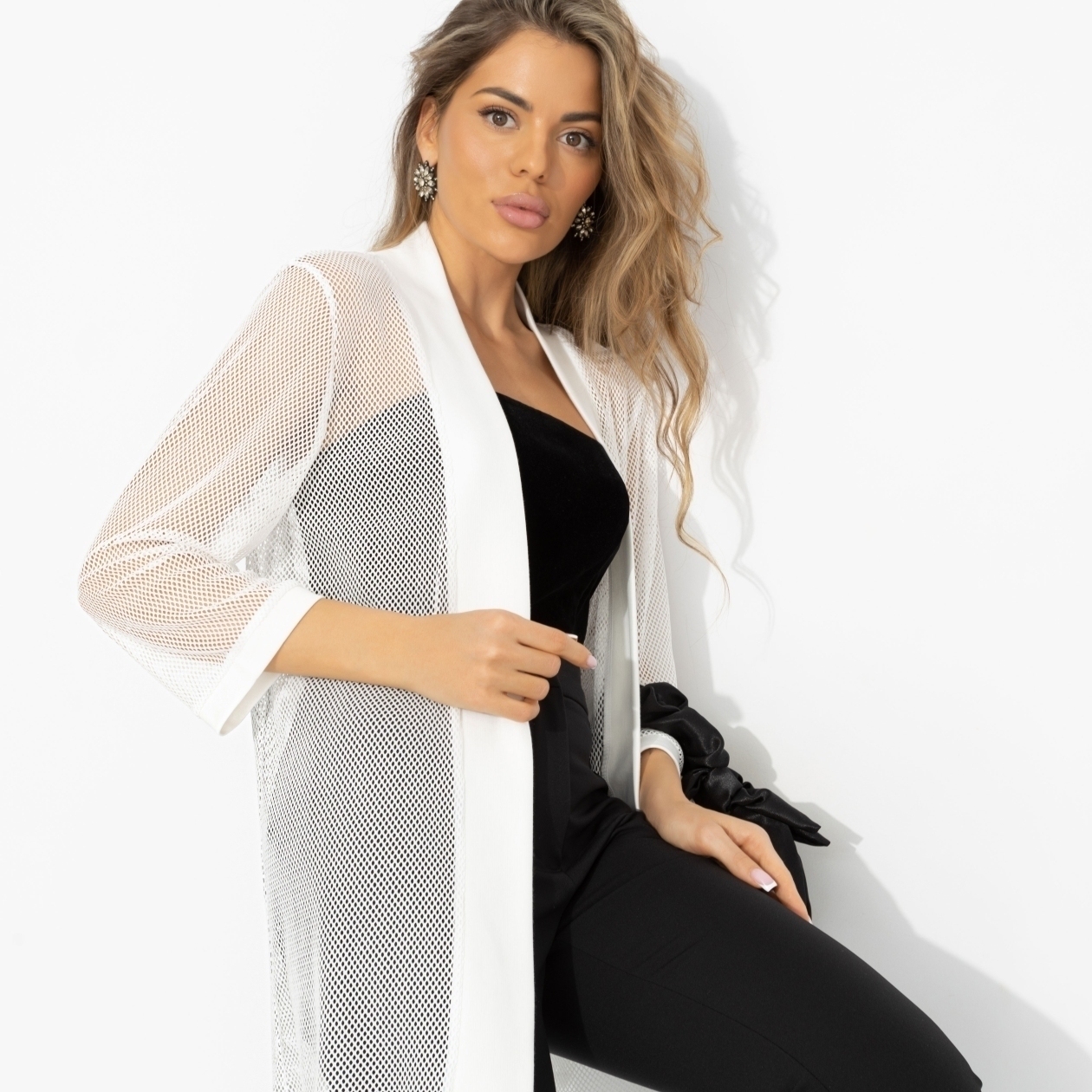 Заметили, как часто в кадрах о бизнесе и важных решениях героиня накидывает что-то на плечи в самый ответственный момент? Белый кардиган – это тот самый приём. Его легко представить на плечах амбициозной Шивон Рой из «Наследников». Лёгкая сетка-стрейч создаёт ощущение прозрачности и многослойности. Кардиган удобно носить поверх платьев, топов и блуз – как финальный штрих. Белый цвет добавляет свежести и визуального света. Подходит для офиса, мероприятий и образов, где важна элегантная недосказанность. Изделие без пояса.