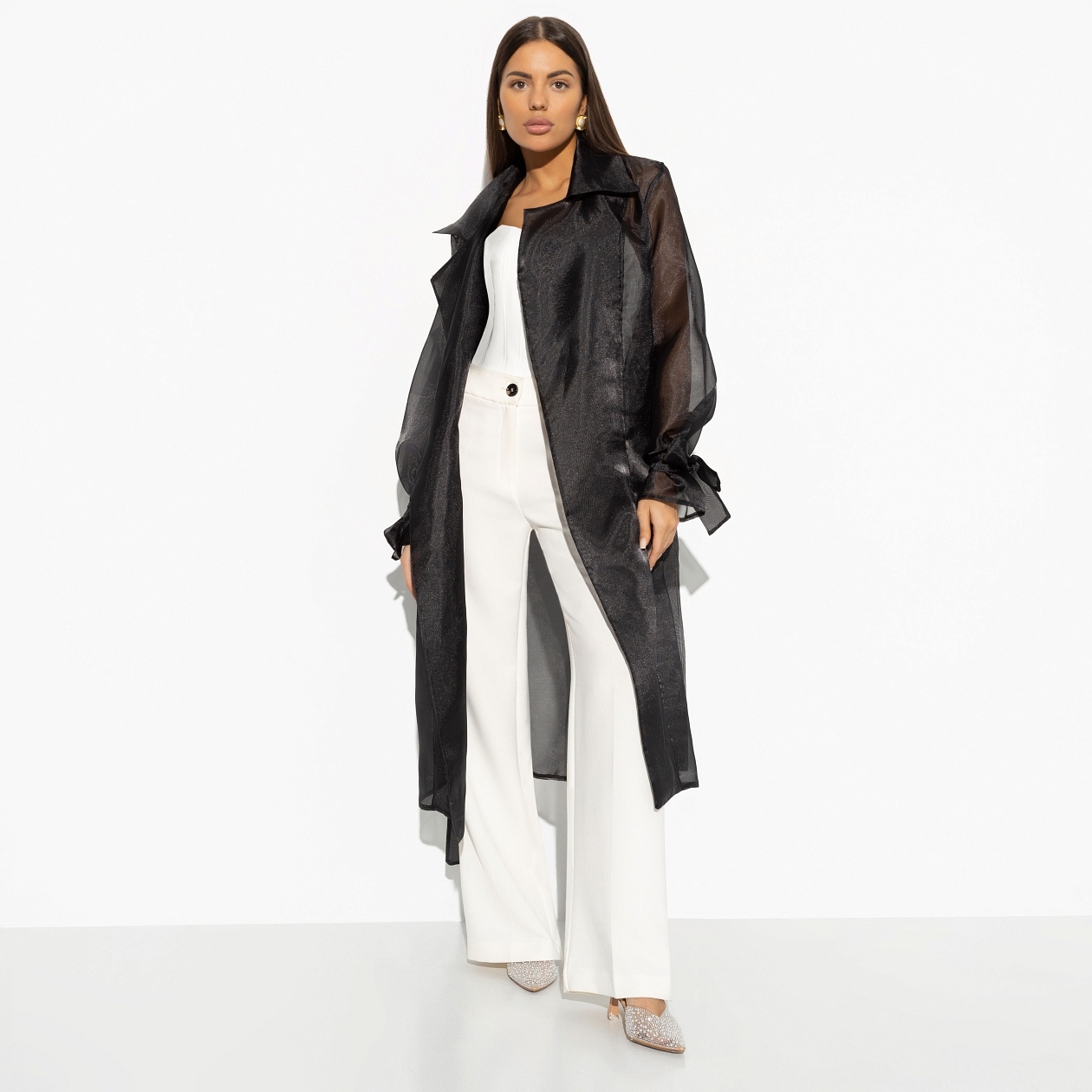 Что-то на сказочном. История о королеве в прозрачном кардигане захватывает с первых секунд. Безусловно, это королева добрая и наделенная навыком воплощать все мечты в действительность. Кардиган классического кроя из полупрозрачной ткани с лацканами. Объемные завязки из лент на рукавах изделия. Длина миди. Есть широкий пояс из материала изделия в комплекте.
