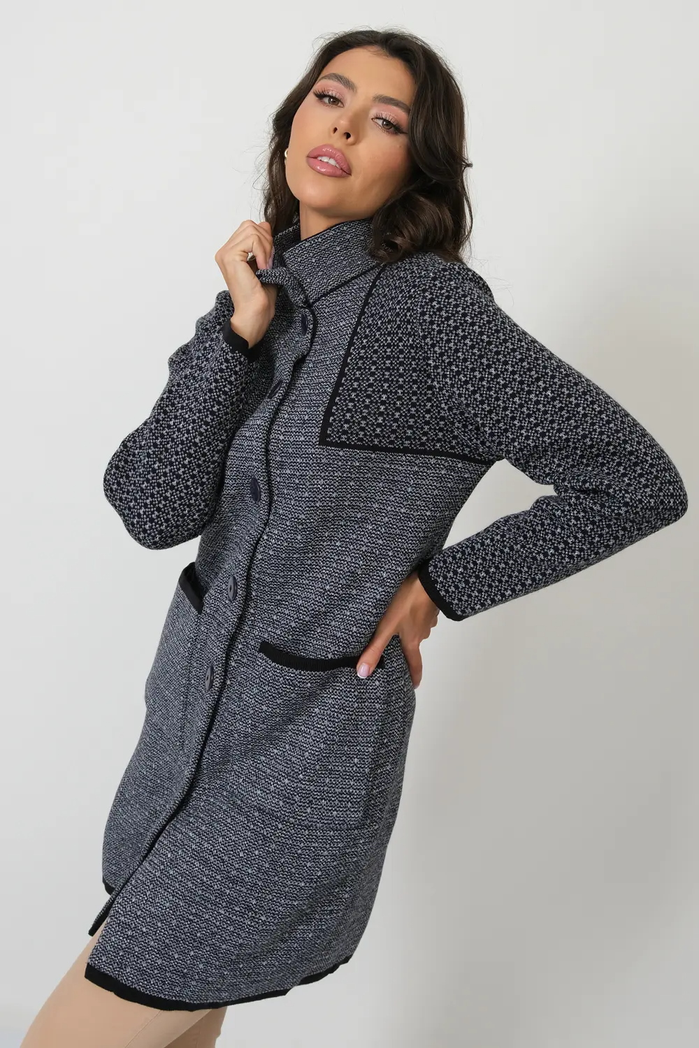 Женский вязаный кардиган полуприлегающего силуэта с воротником-стойкой. Кардиган застегивается на пуговицы. Рукава втачные длинные.  Накладные карманы прямоугольной  формы. Кардиган выполнен жаккардовым переплетением. джинсовый микс