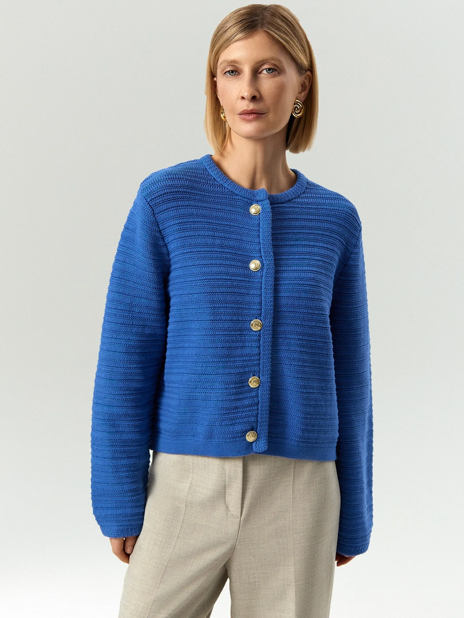 Яркий кардиган из натурального хлопка украсит повседневный гардероб. Выполнен в английском стиле, с крупной вязкой, стильным рельефным плетением и нарядной фурнитурой, которая украшена чеканкой. Золотой цвет фурнитуры отлично сочетается с насыщенным синим фоном. Кардиган можно стилизовать как в кэжуальных, так и в классических образах.