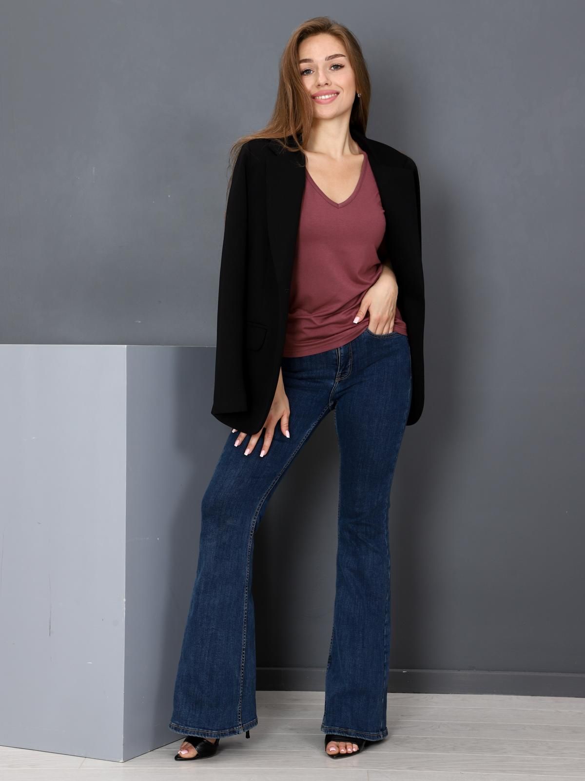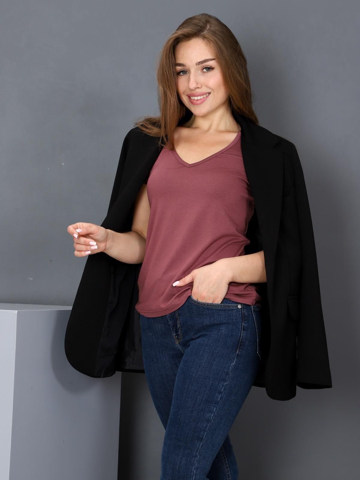 Женская футболка выполнена из трикотажного полотна "вискоза". Футболка полу прилегающего силуэта, с рукавом, горловина с глубоким V-образным вырезом, обработанным бейкой.