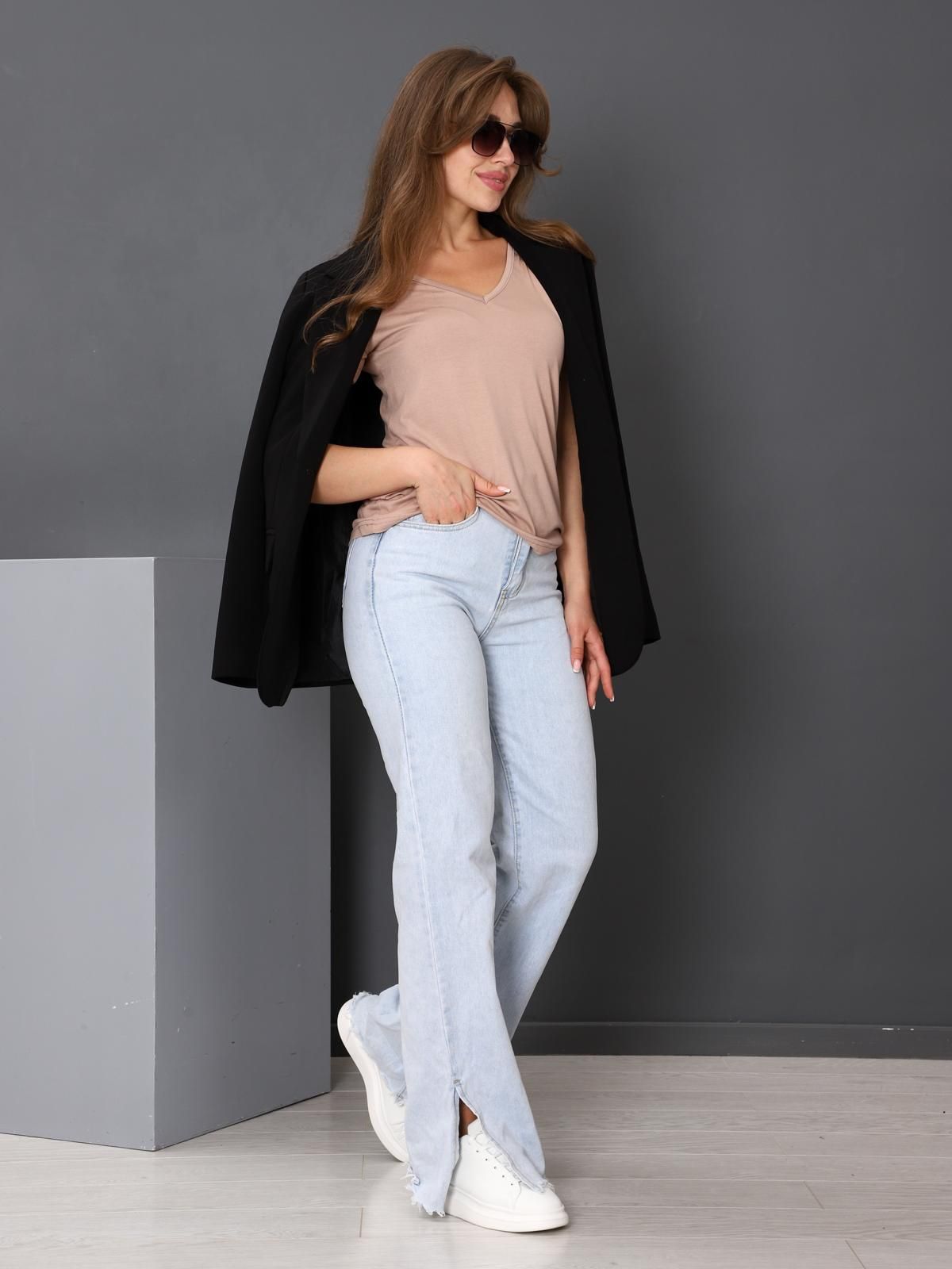 Женская футболка выполнена из трикотажного полотна "вискоза". Футболка полу прилегающего силуэта, с рукавом, горловина с глубоким V-образным вырезом, обработанным бейкой.
