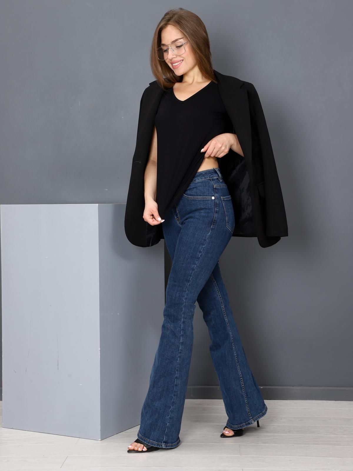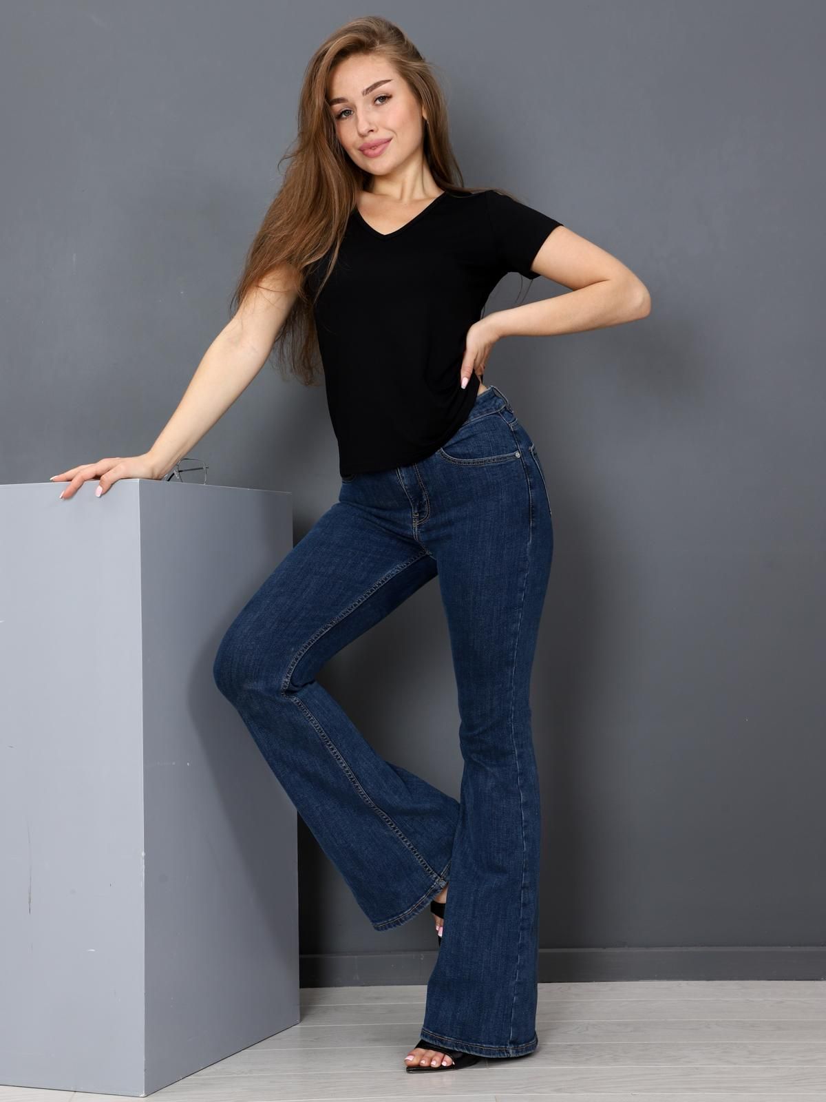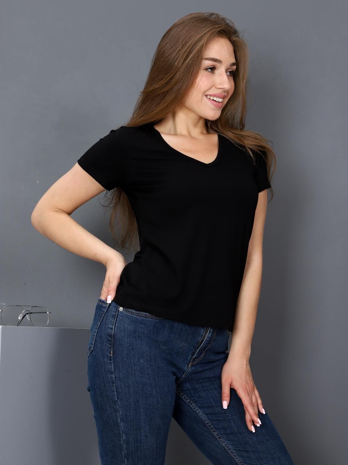 Женская футболка выполнена из трикотажного полотна "вискоза". Футболка полу прилегающего силуэта, с рукавом, горловина с глубоким V-образным вырезом, обработанным бейкой.